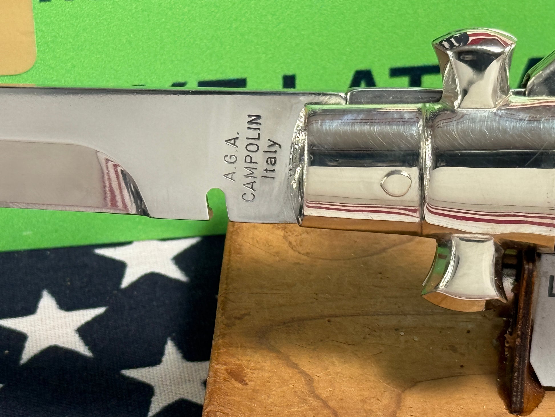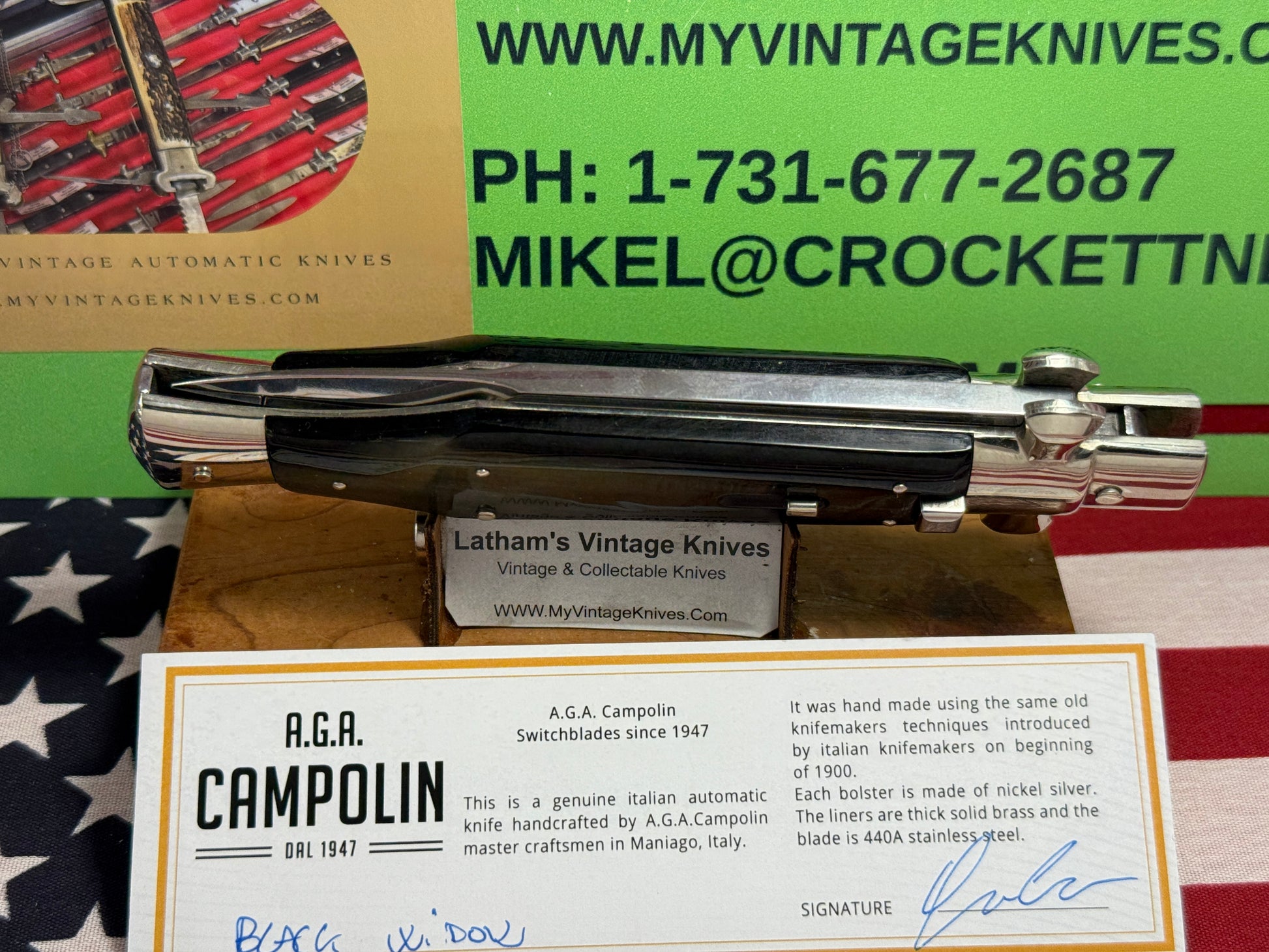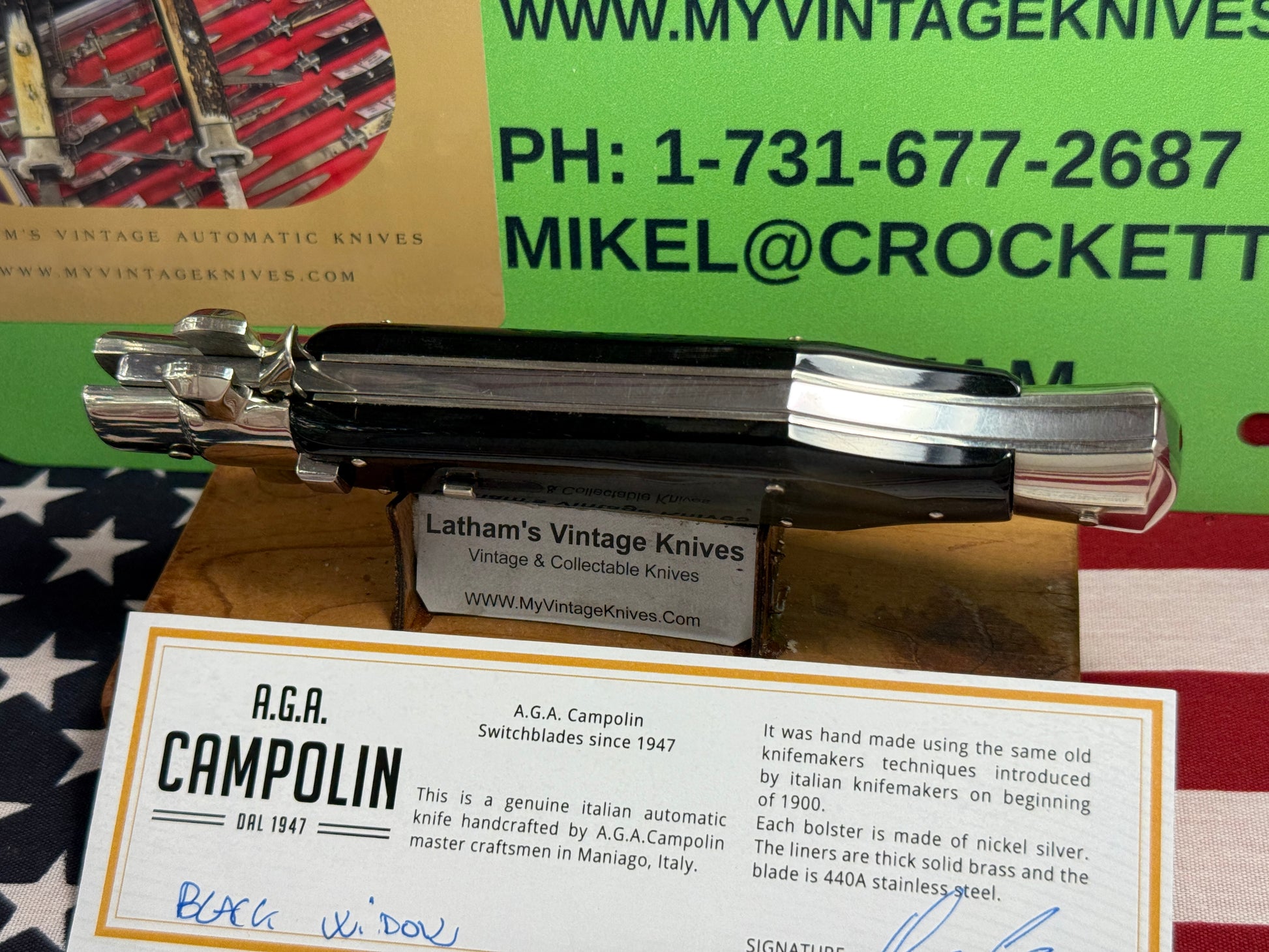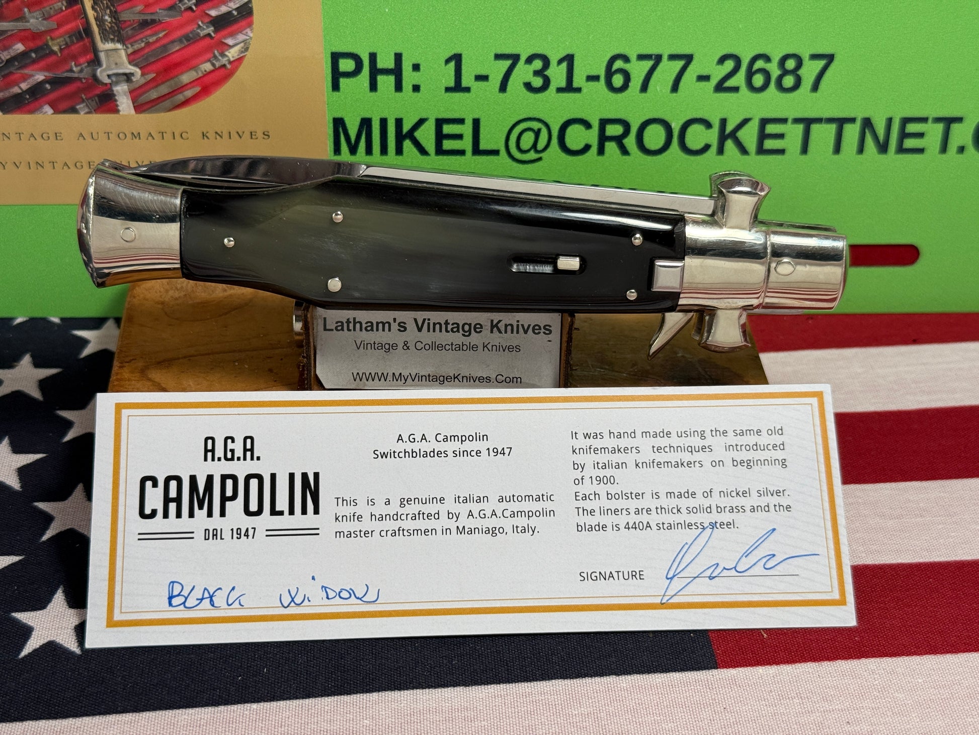A.G.A. CAMPOLIN MANIAGO ITALY 2023 FULCRUM RELEASE SQUARE BUTTON BLACK WIDOW ITALIAN AUTOMATIC KNIFE BUFFALO HORN HANDLES
