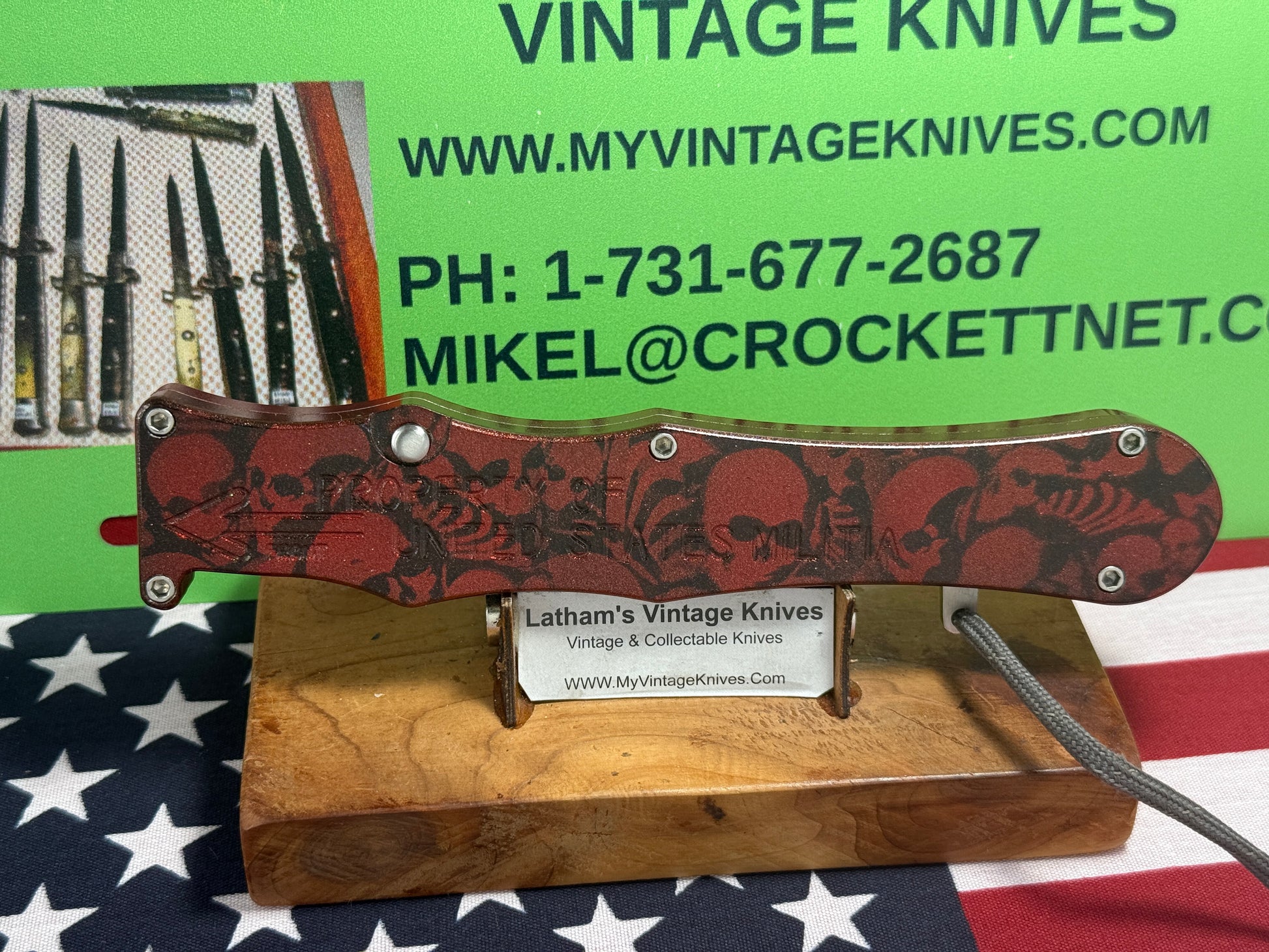 DALTON, ROB CUSTOM AUTOMATIC KNIFE 1998-2010 OTF SINGLE ACTION MAYHEM PROPERTY OF MILITIA TACTICAL AUTOMATIC KNIFE RED METALIC METAL HANDLES