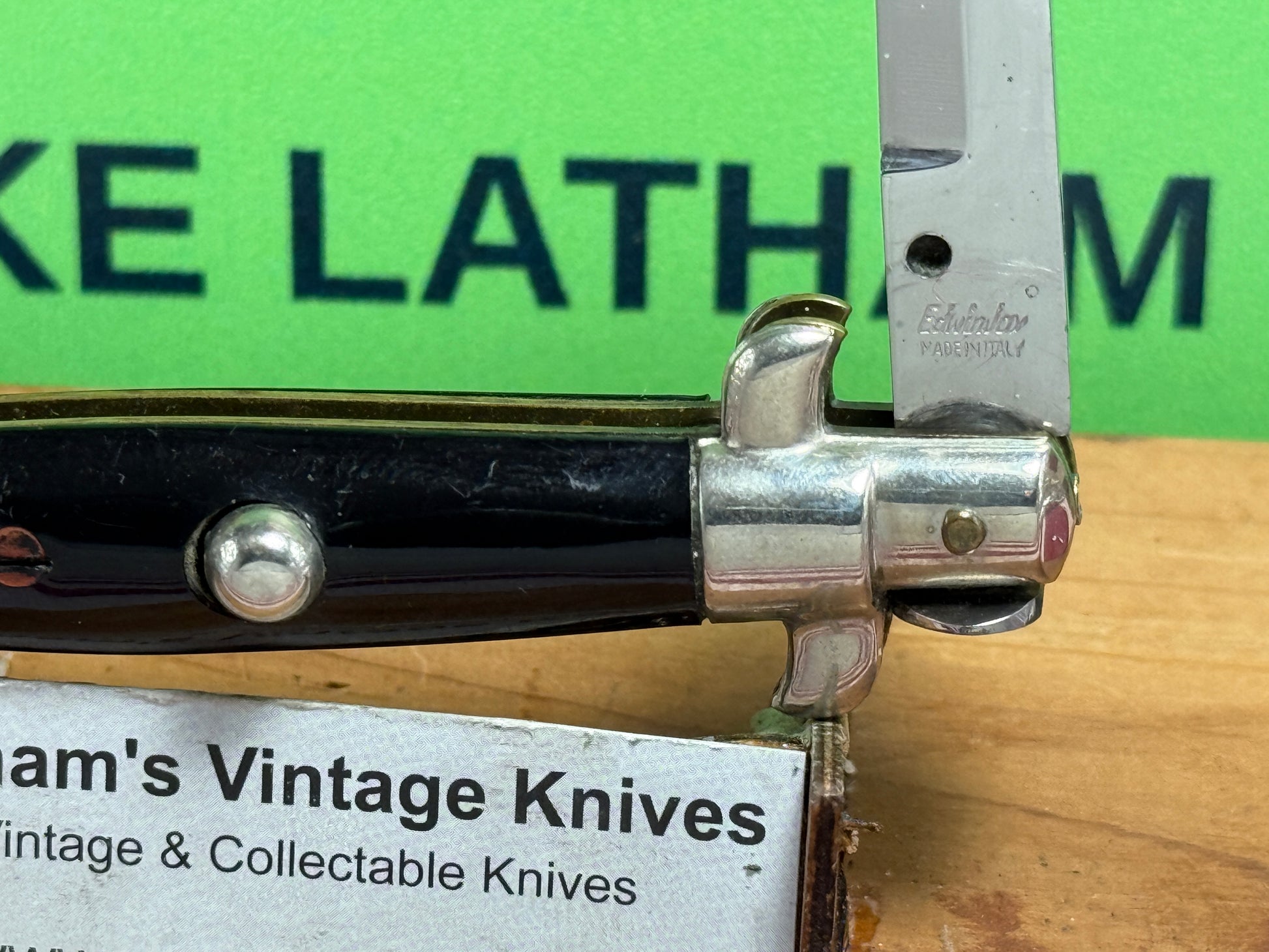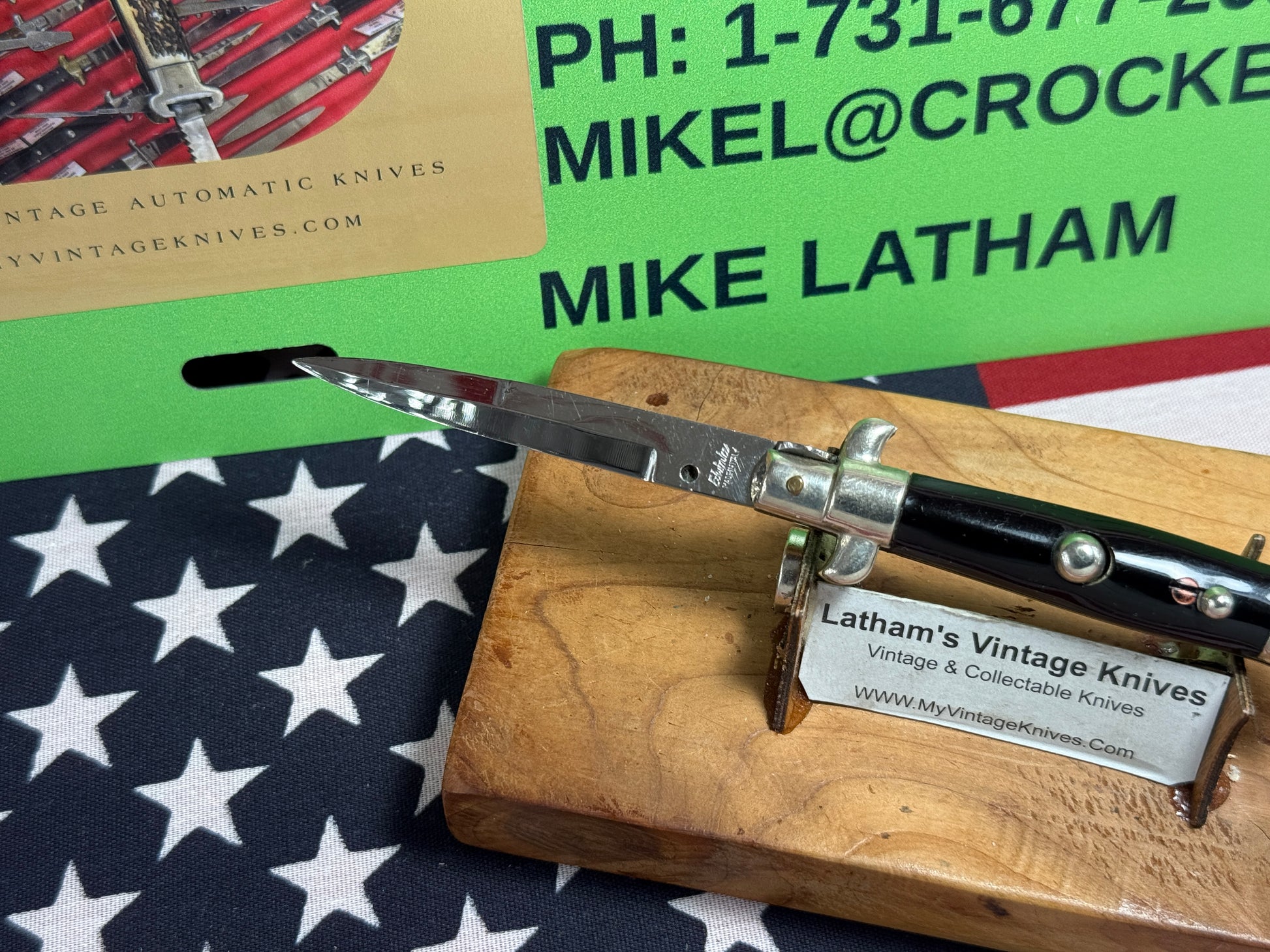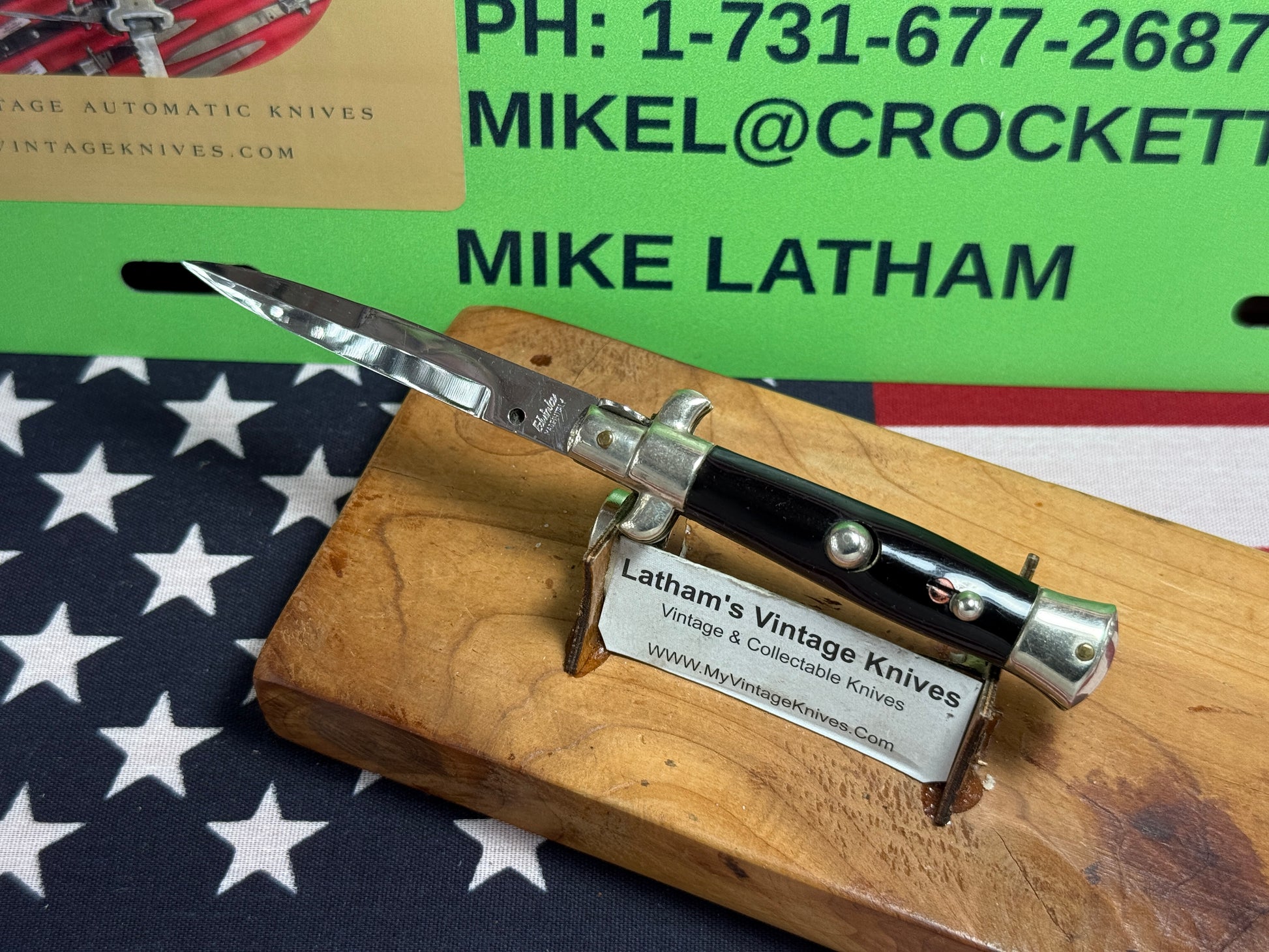 EDWIN JAY ITALY 1950-52 PICK LOCK STILETTO TAB BRACKETS 14 CM ITALIAN AUTOMATIC KNIFE BLACK SHELL WRAP HANDLES
