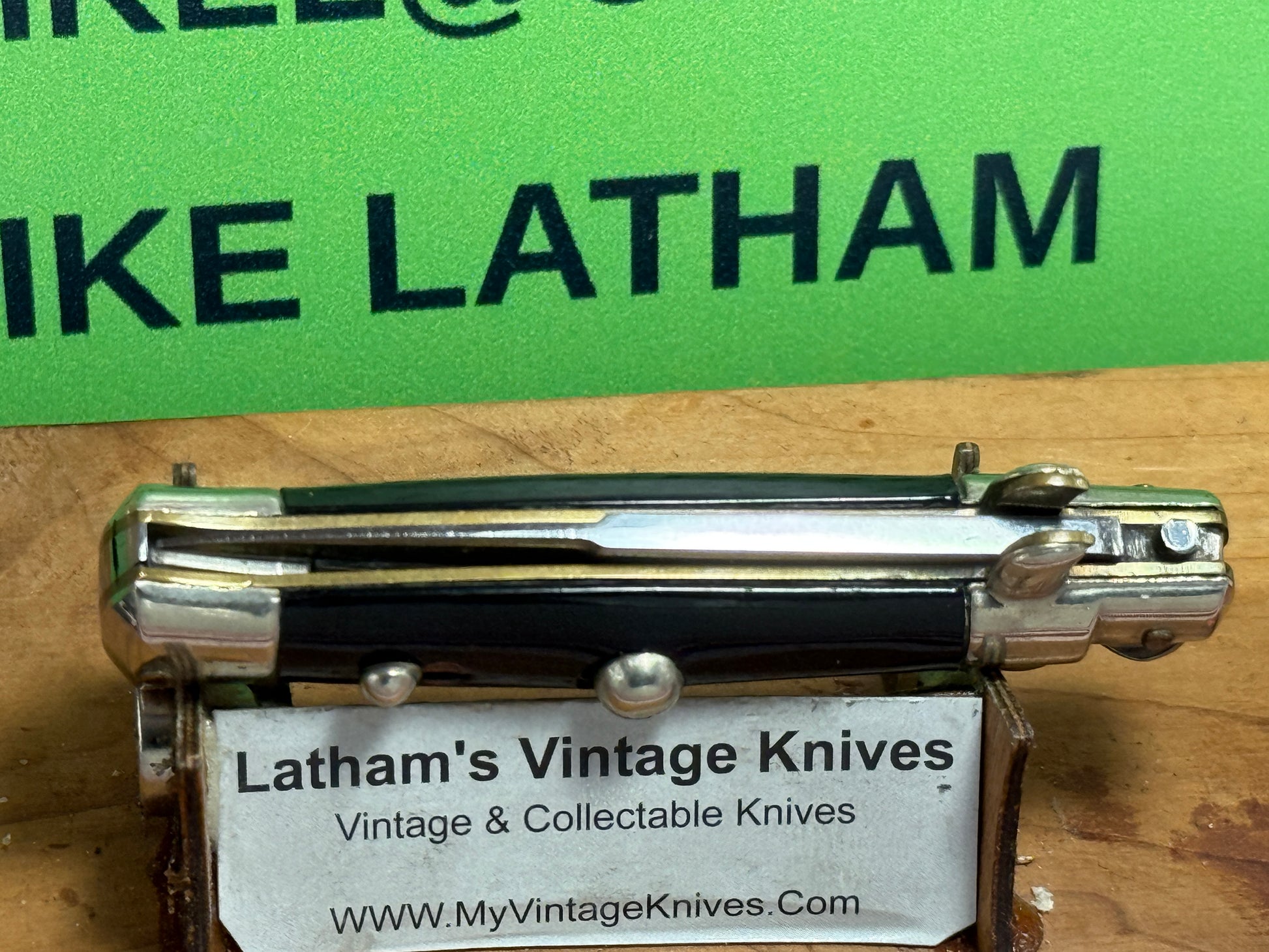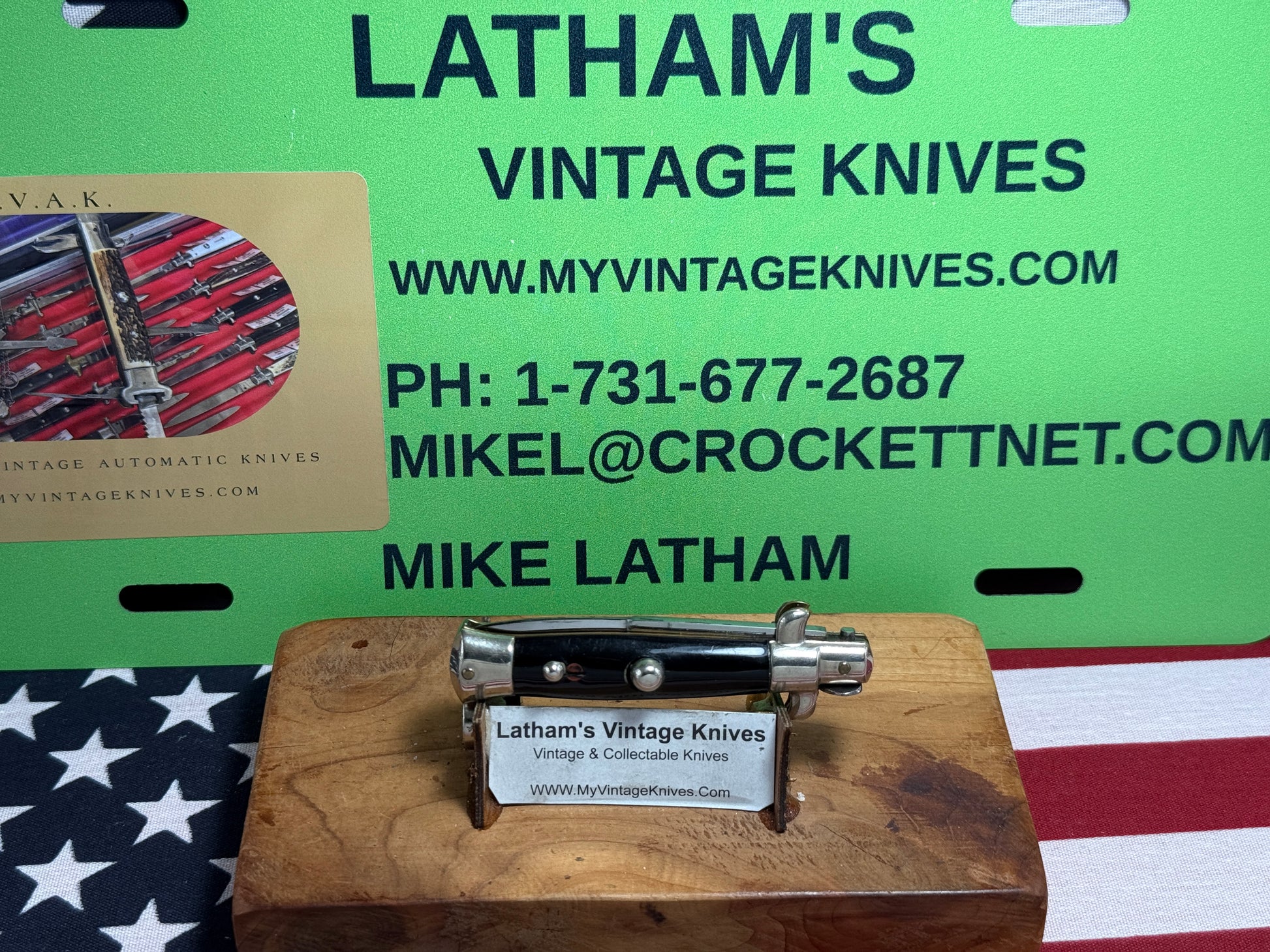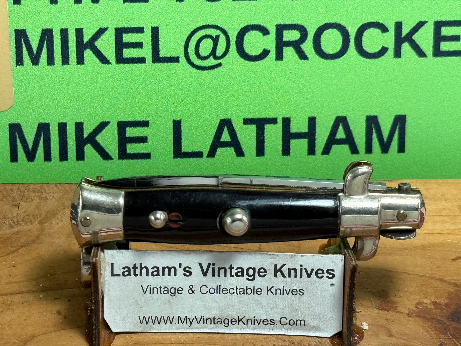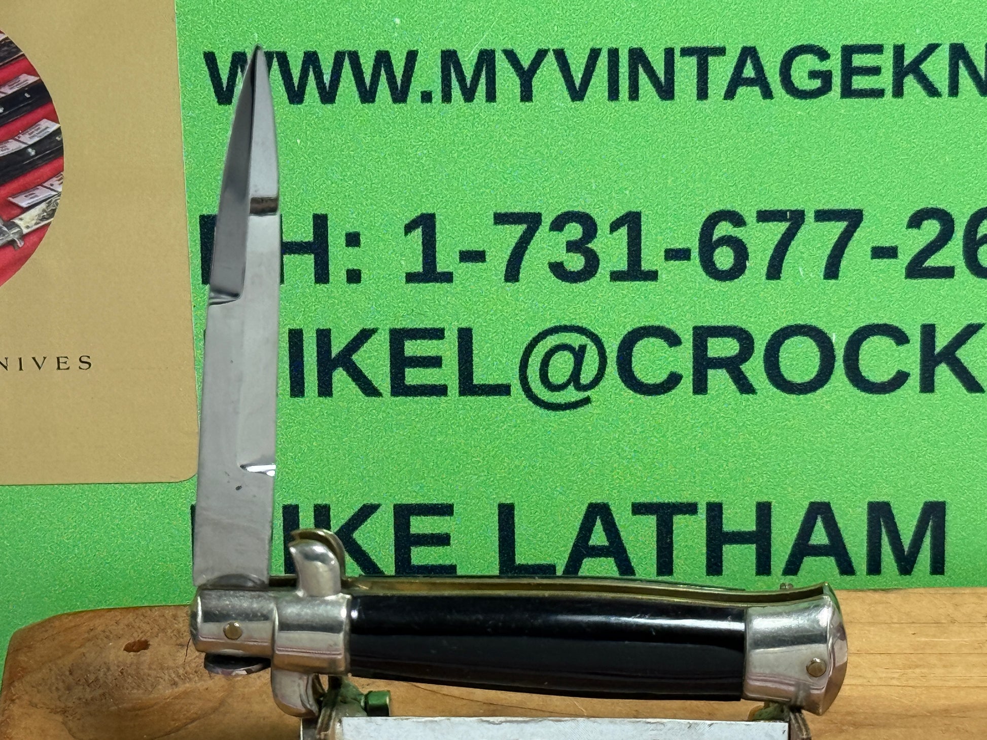 EDWIN JAY ITALY 1950-52 PICK LOCK STILETTO TAB BRACKETS 14 CM ITALIAN AUTOMATIC KNIFE BLACK SHELL WRAP HANDLES