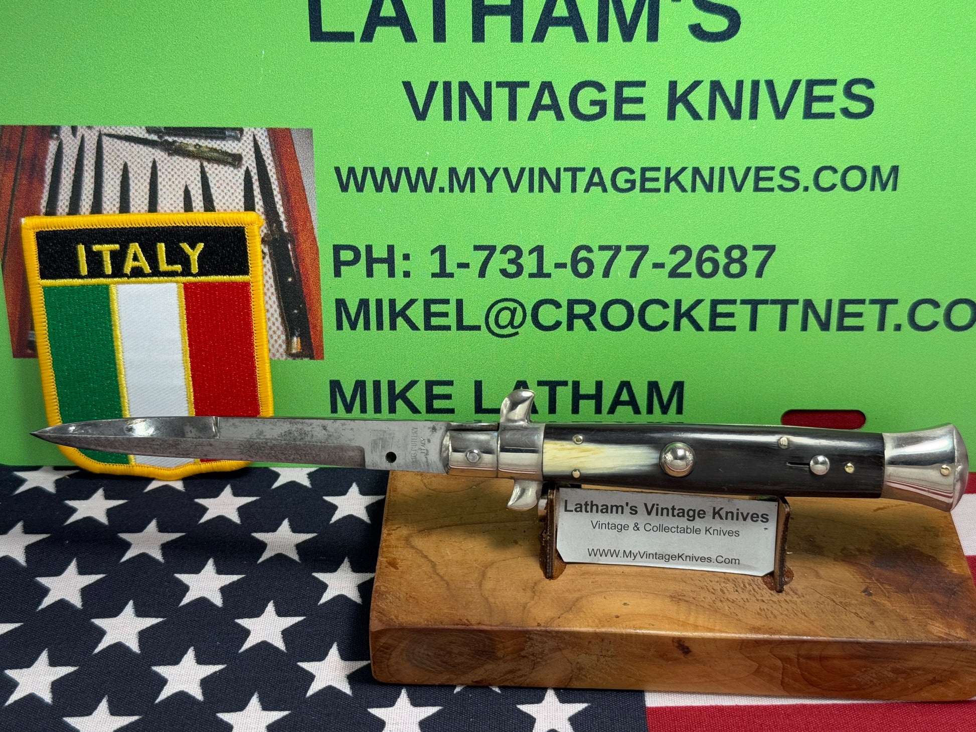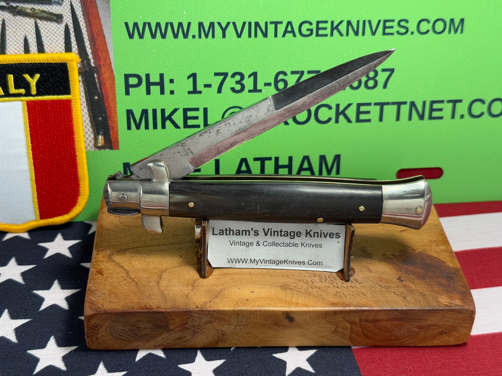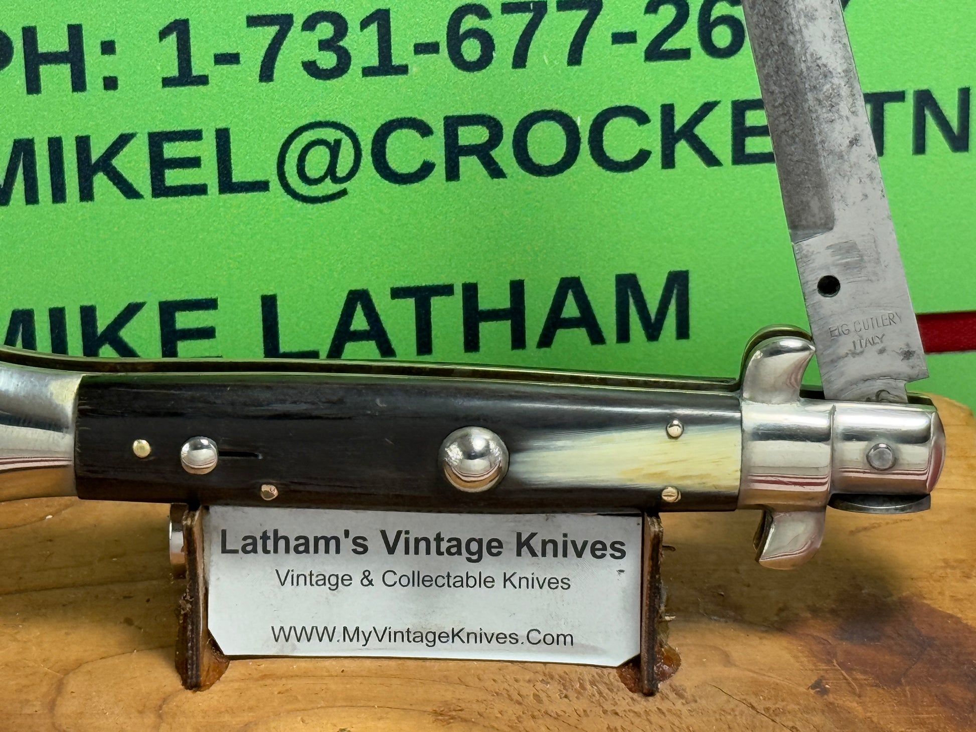 EIG CUTLERY ITALY 1950-57 PICK LOCK STILETTO 23 CM ITALIAN AUTOMATIC KNIFE BUFFALO HORN HANDLES