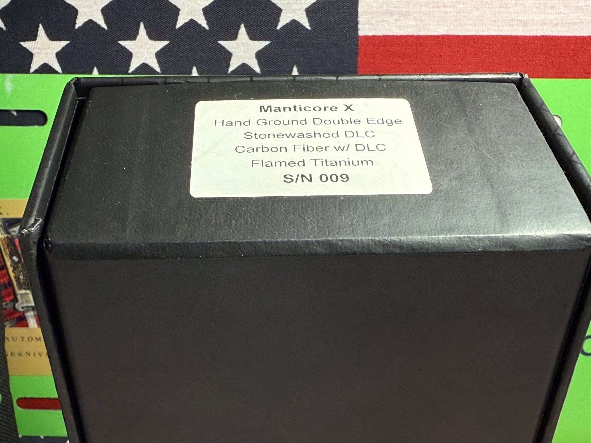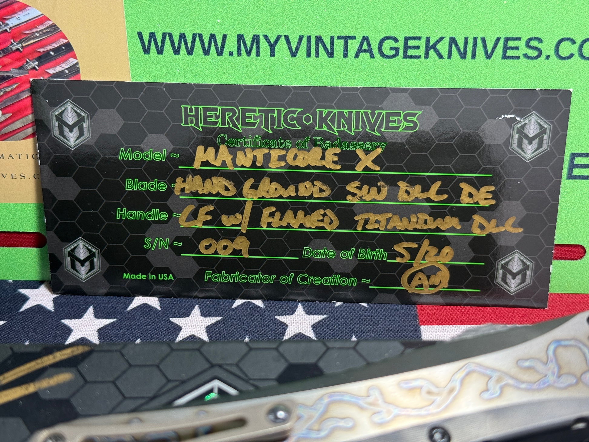 HERETIC KNIVES USA 2020 CUSTOM OTF MANTICORE X D/E CARBON FIBER FRONT W/ DLC FLAMED TITANIUM BACK HANDLE HAND GROUND STONEWASHED DLC BLADE CUSTOM AUTOMATIC KNIFE