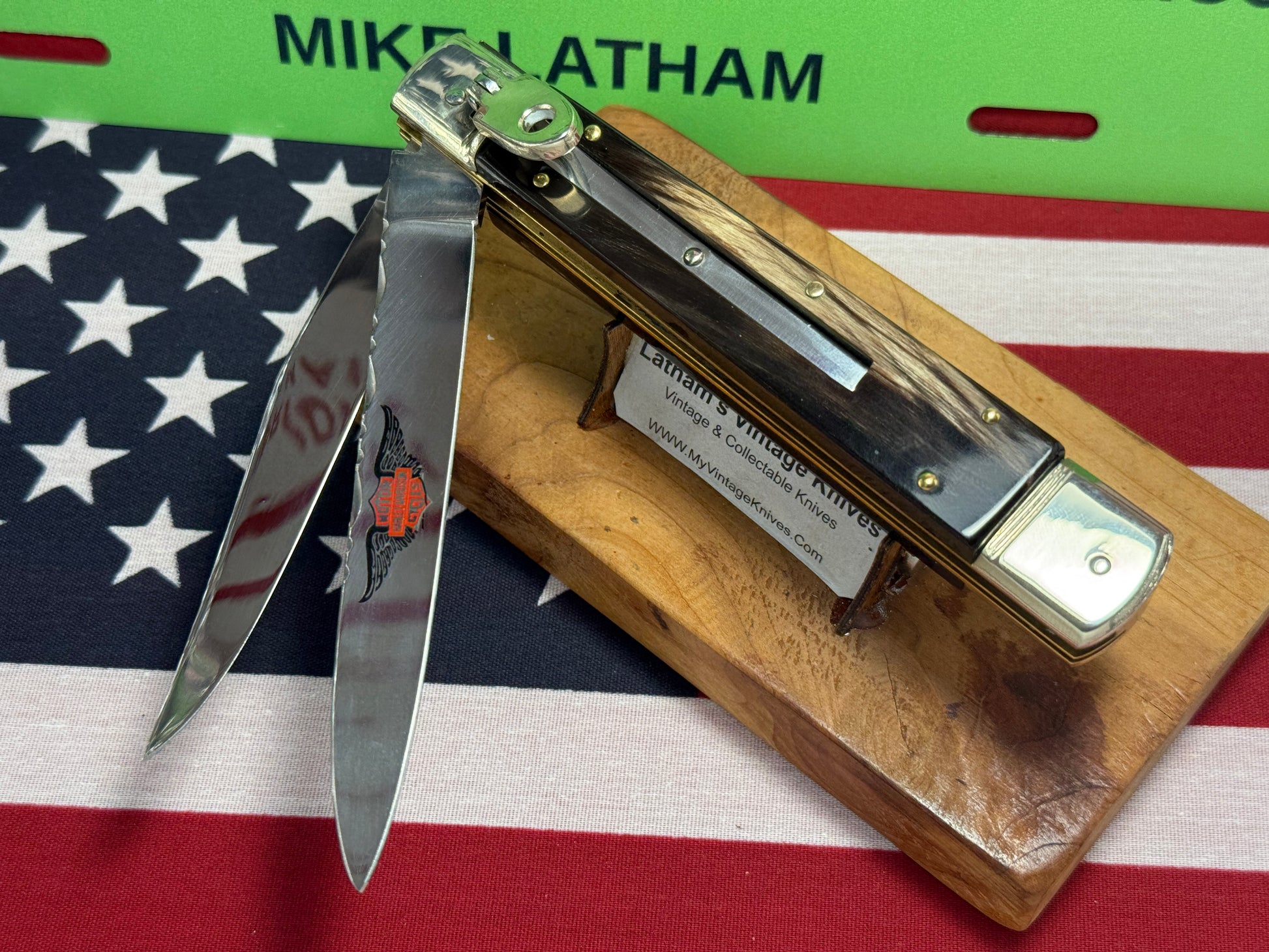 HUBERTUS SOLINGEN GERMANY 2005-2010 ERA LEVER AUTOMATIC 14 CM 2BL "HARLEY DAVIDSON LIMITED EDITION" GERMAN AUTOMATIC KNIFE BUFFALO HORN HANDLES