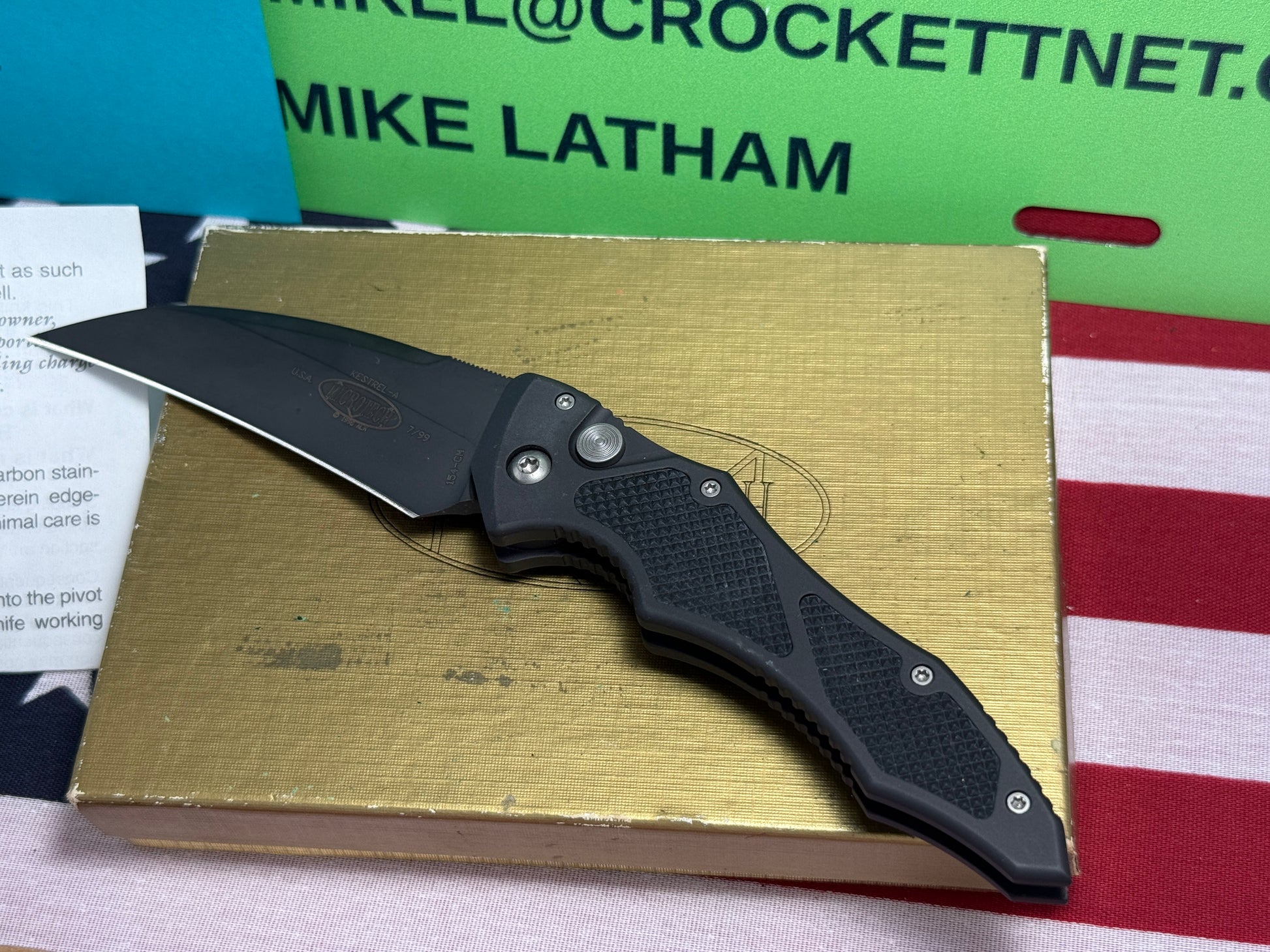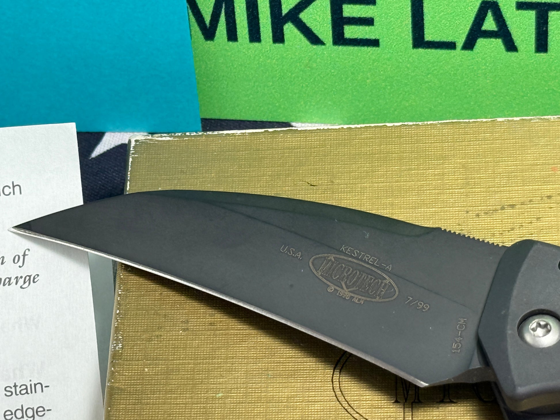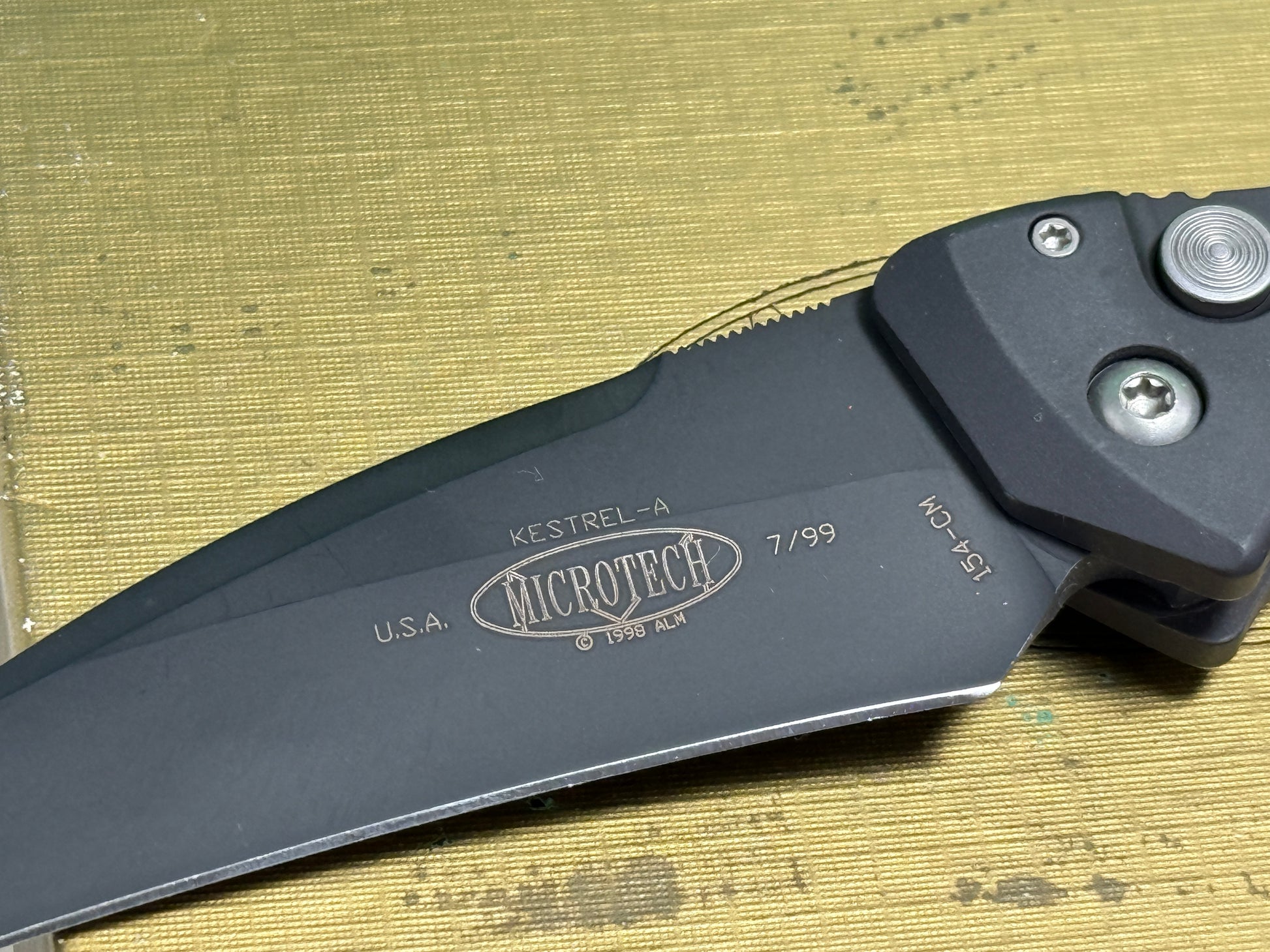 MICROTECH USA 7/1999 KESTREL-A SIDE OPENING 154-CM TACTICAL AUTOMATIC KNIFE BLACK METAL HANDLES