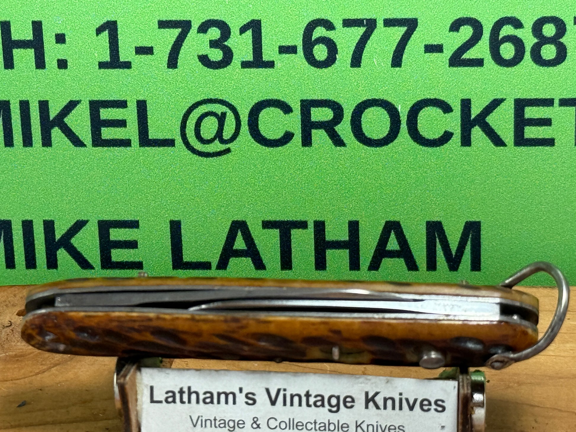 PRESTO GEO. SCHRADE BRIDGEPORT CONN. 1935-40 TWIN BLADE GIRL SCOUT EDITION WITH BAIL VINTAGE AMERICAN AUTOAMTIC KNIFE 3 3/8" DOUBLE BUTTON JIGGED BONE HANDLES