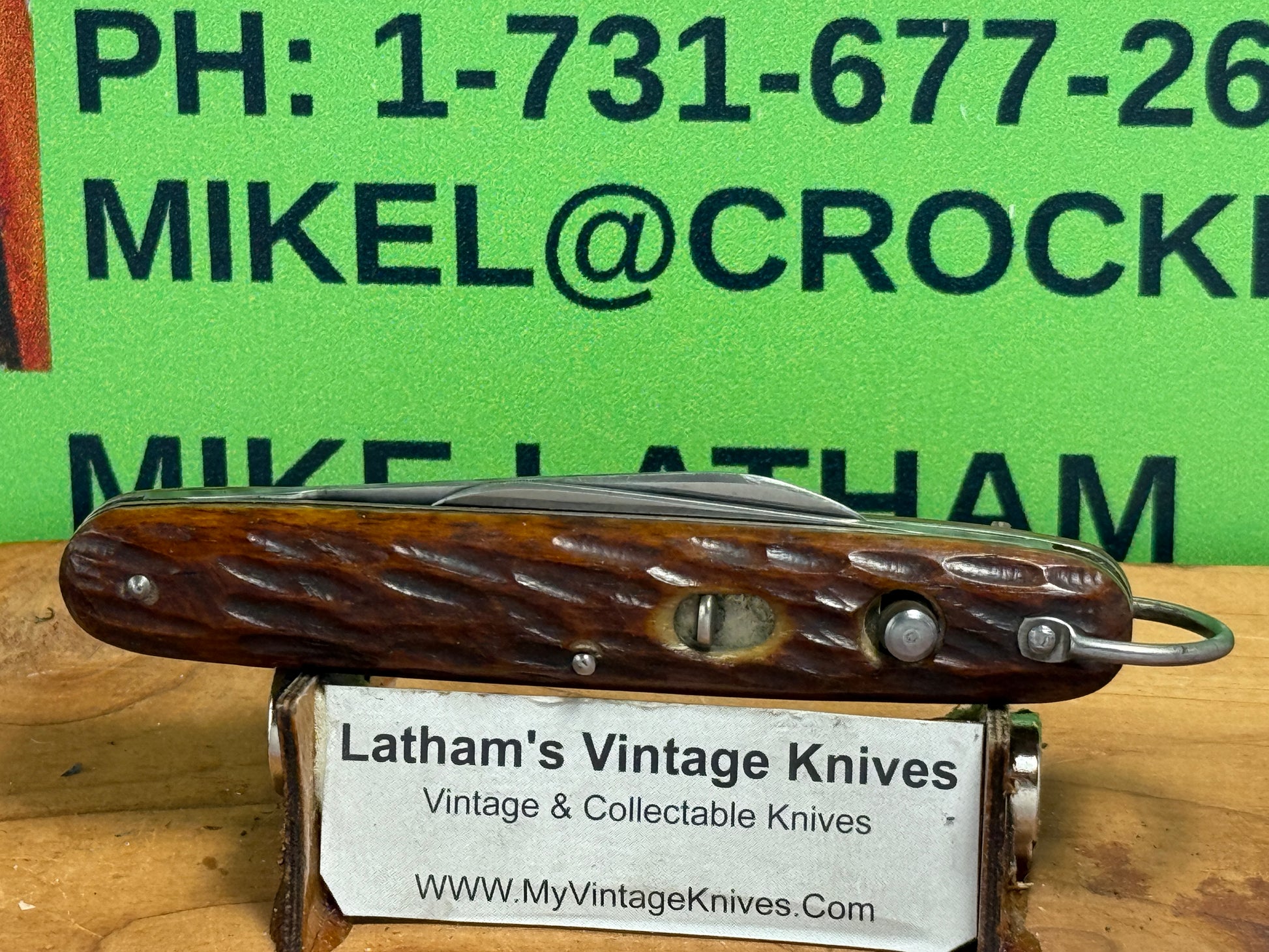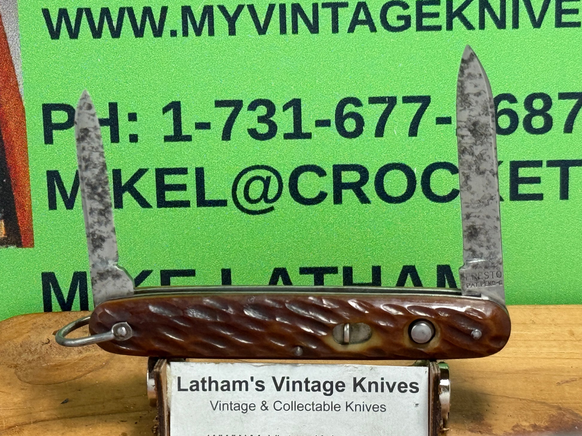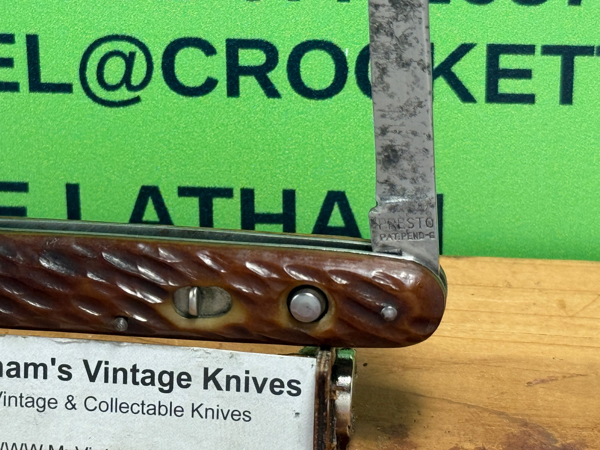 PRESTO GEO. SCHRADE BRIDGEPORT CONN. 1935-40 TWIN BLADE GIRL SCOUT EDITION WITH BAIL VINTAGE AMERICAN AUTOMATIC KNIFE 3 3/8" DOUBLE BUTTON JIGGED BONE HANDLES