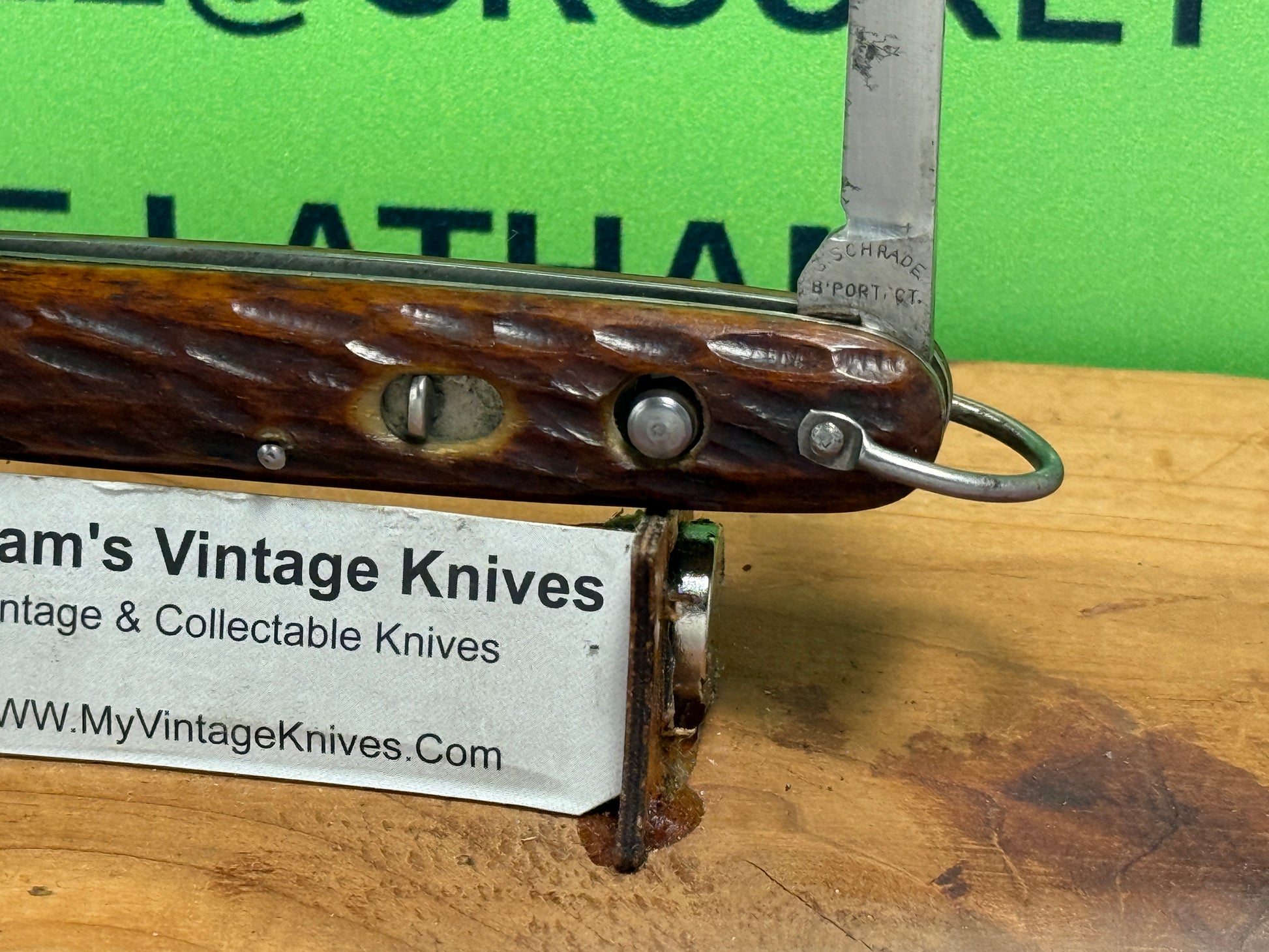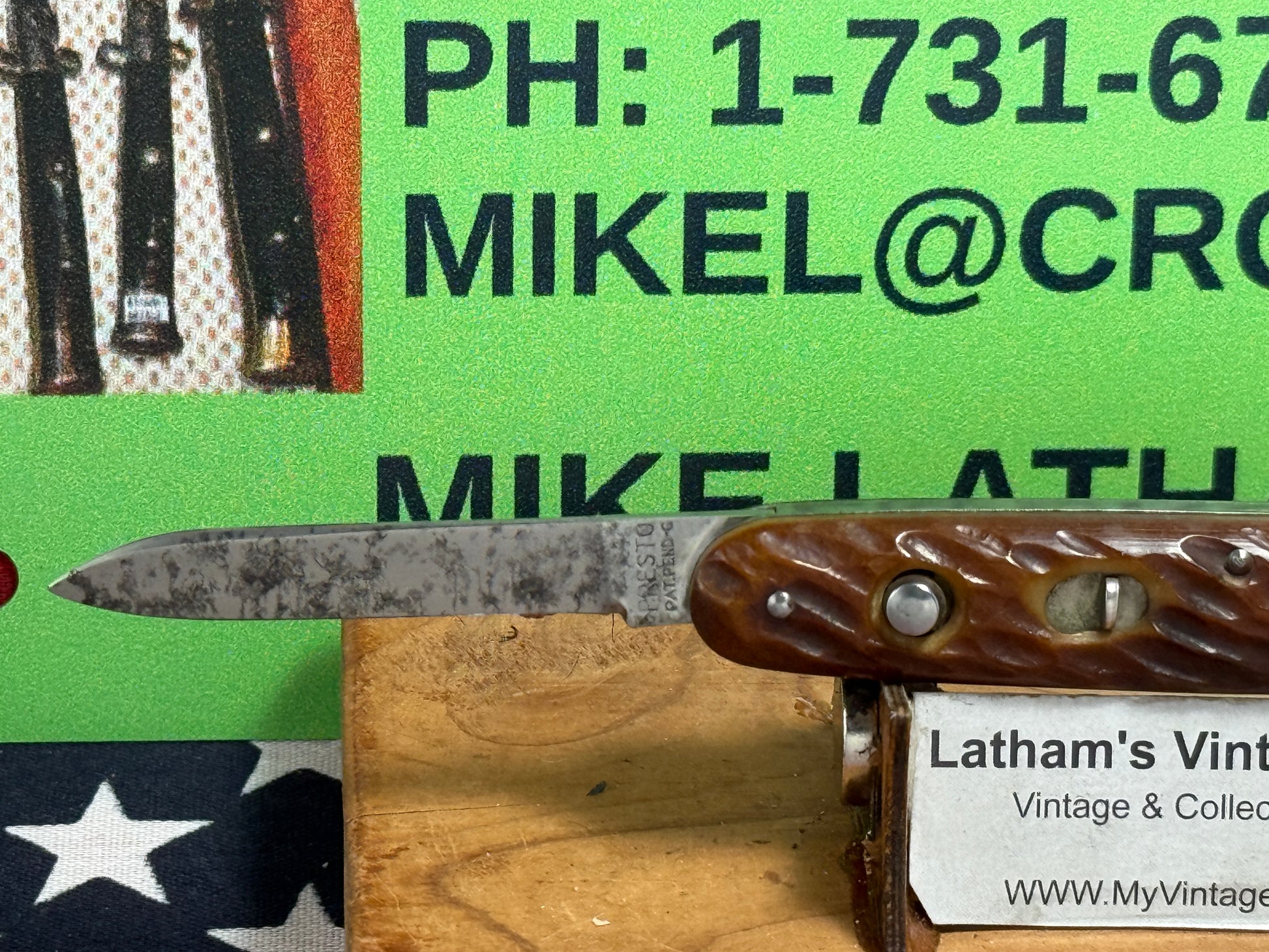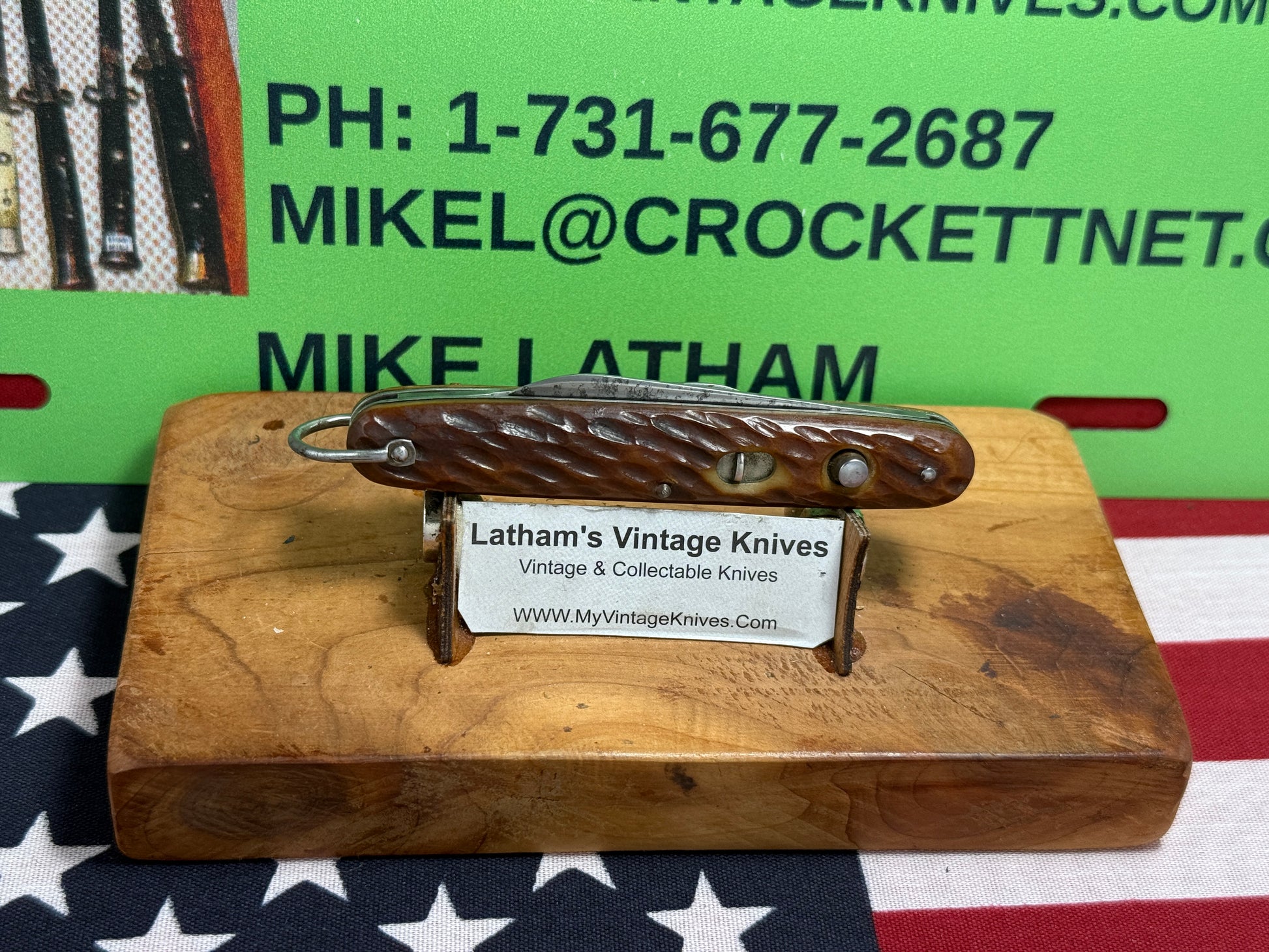PRESTO GEO. SCHRADE BRIDGEPORT CONN. 1935-40 TWIN BLADE GIRL SCOUT EDITION WITH BAIL VINTAGE AMERICAN AUTOMATIC KNIFE 3 3/8" DOUBLE BUTTON JIGGED BONE HANDLES
