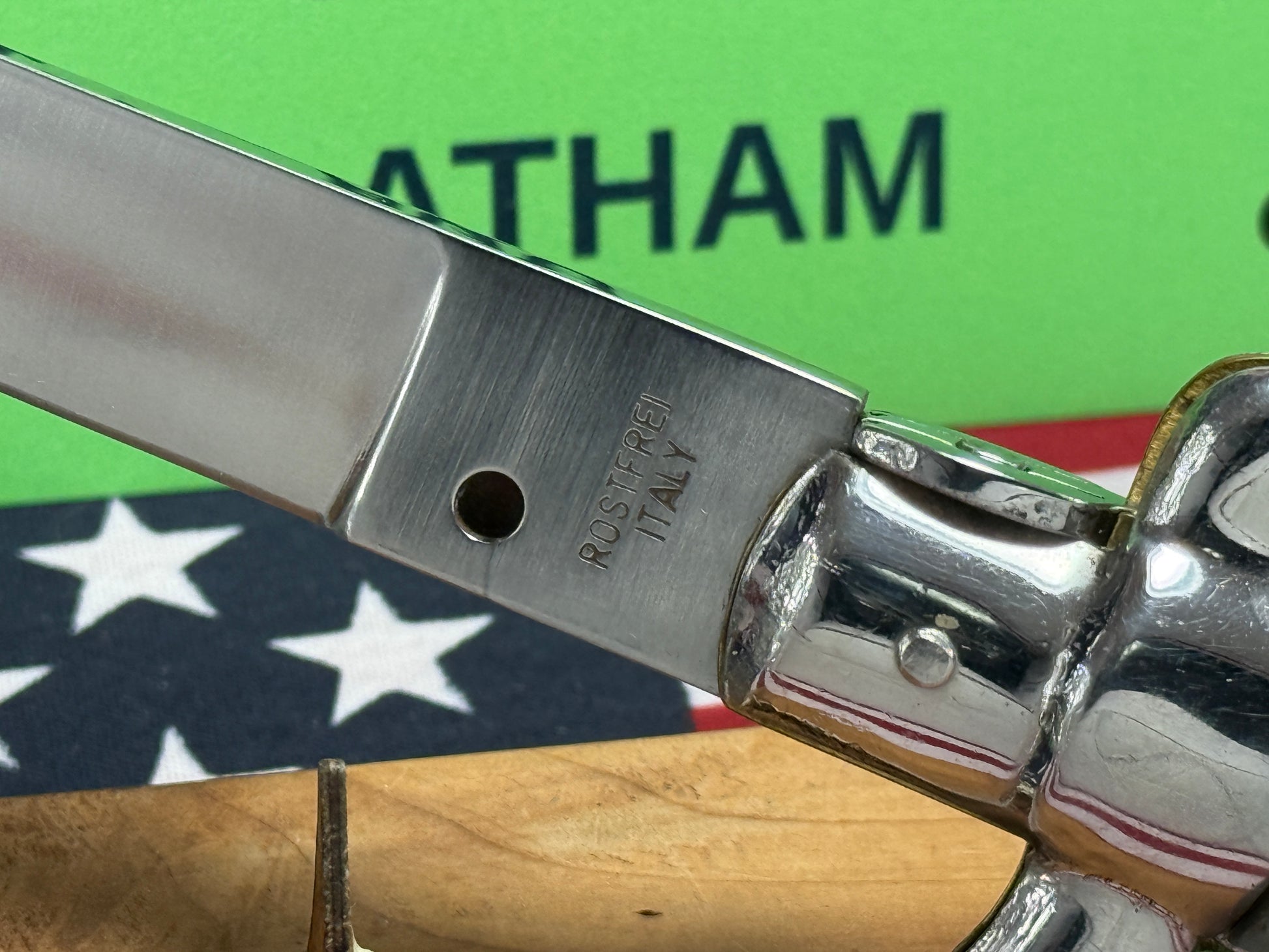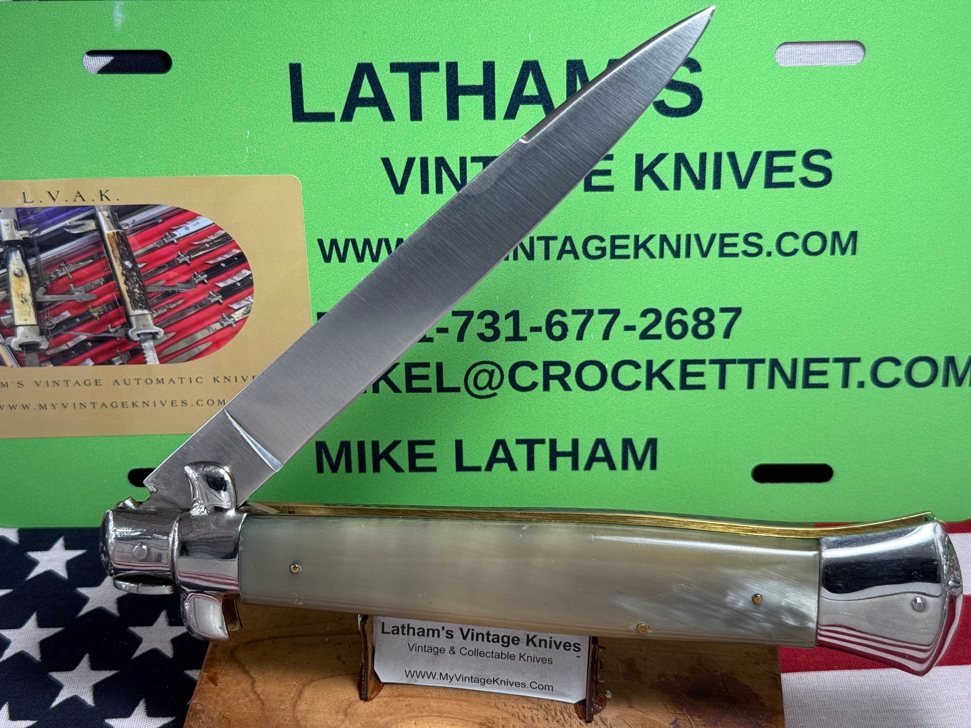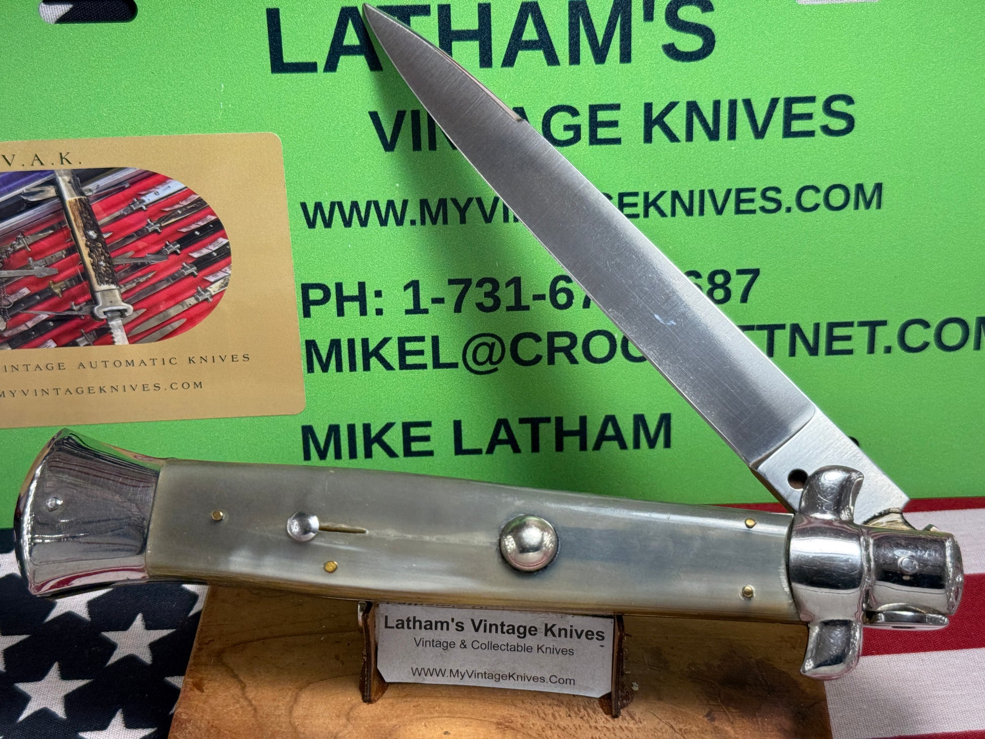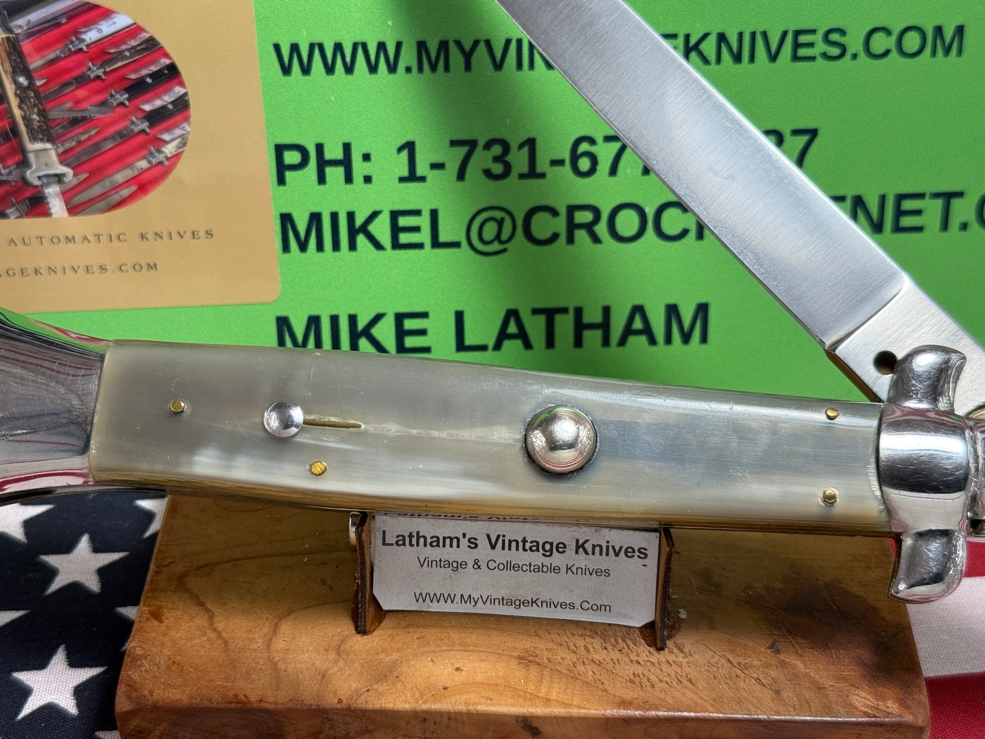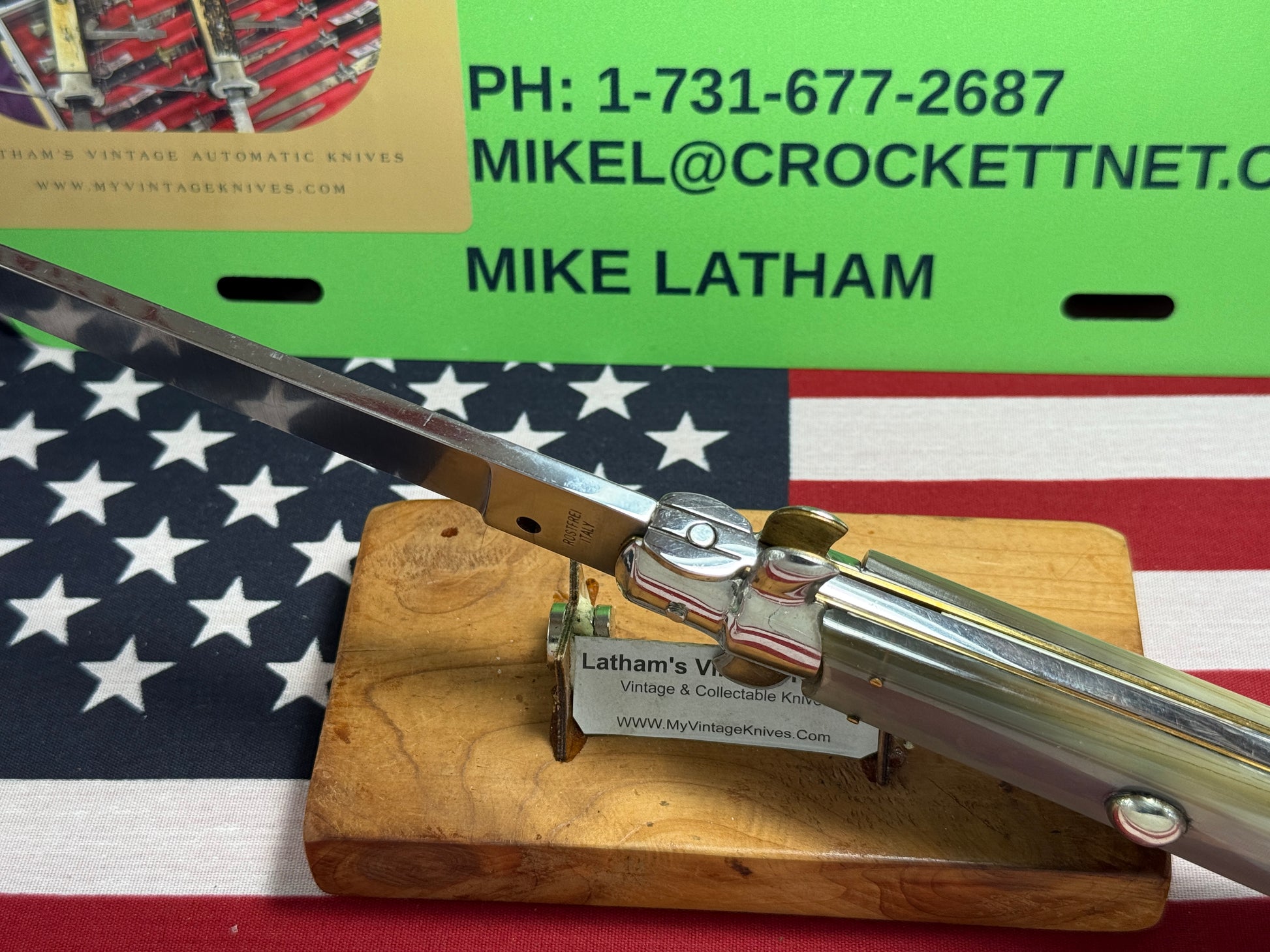 ROSTFREI ITALY 1965-1969 STILETTO SWIVEL BOLSTER 38 CM ITALIAN AUTOMATIC KNIFE TRANSLUCENT BUFFALO HORN HANDLES