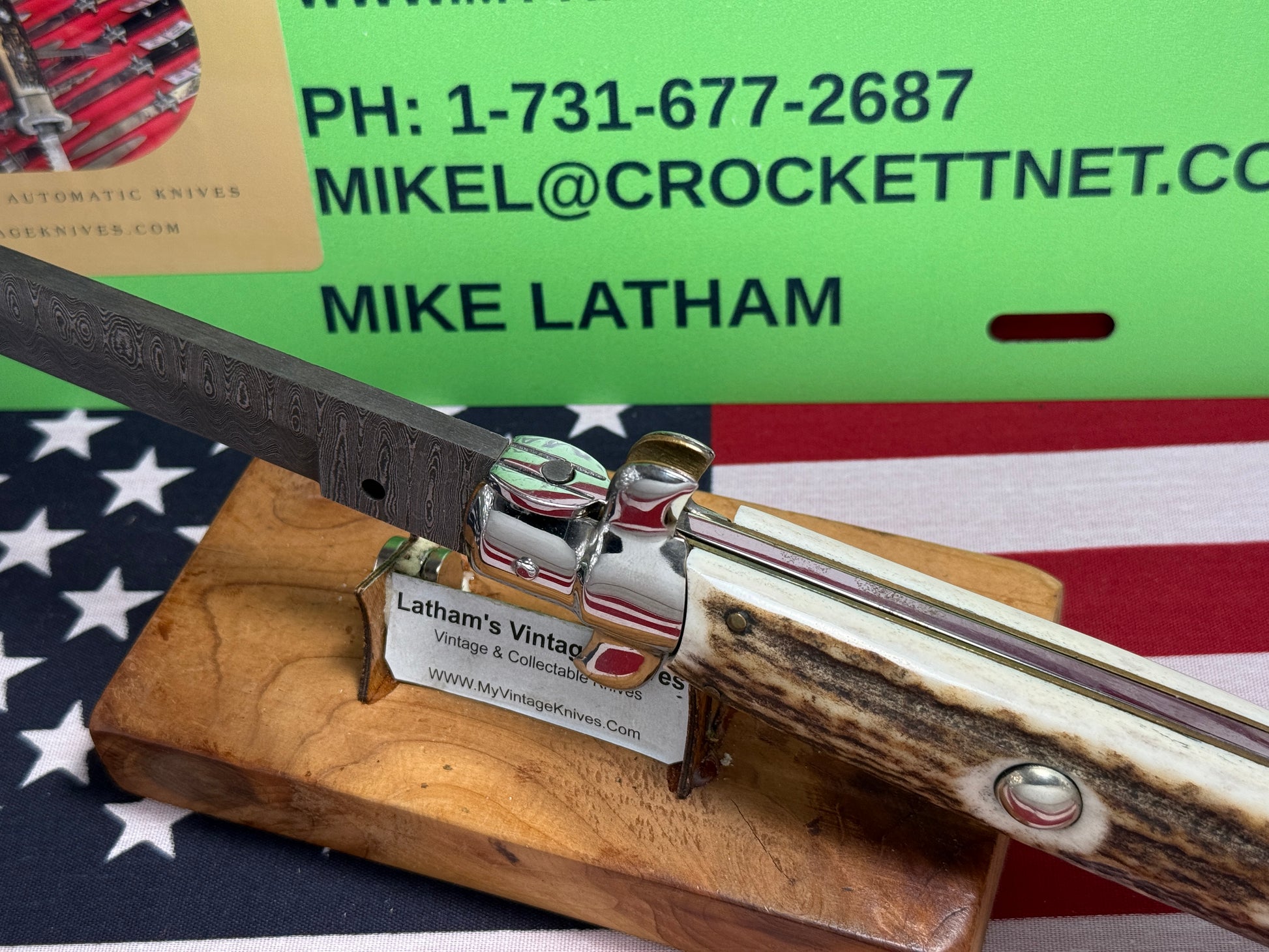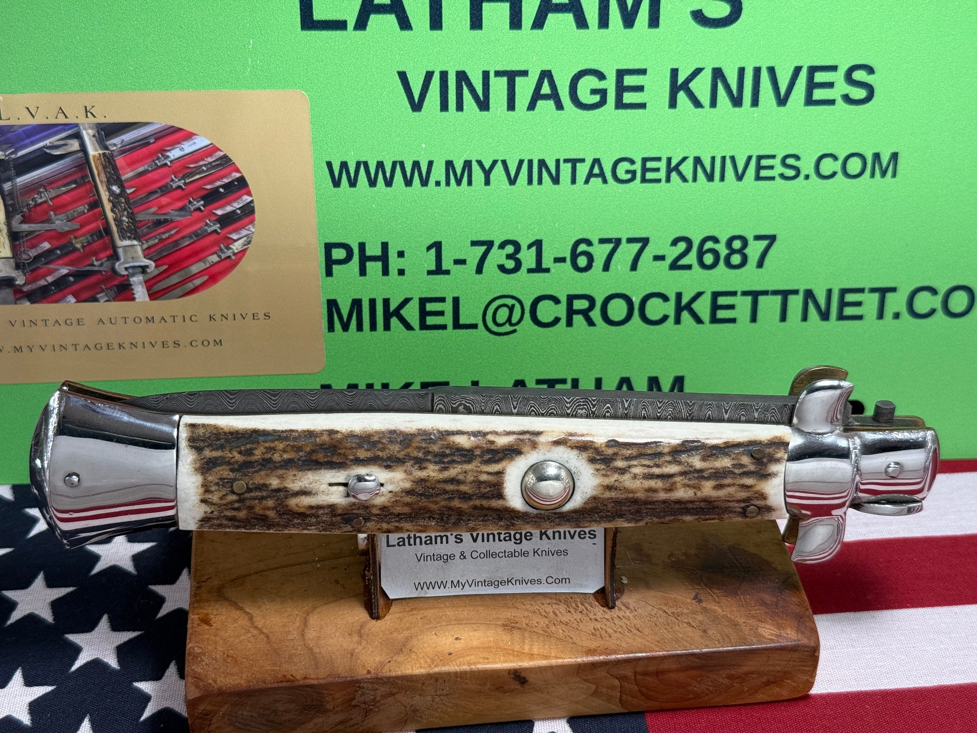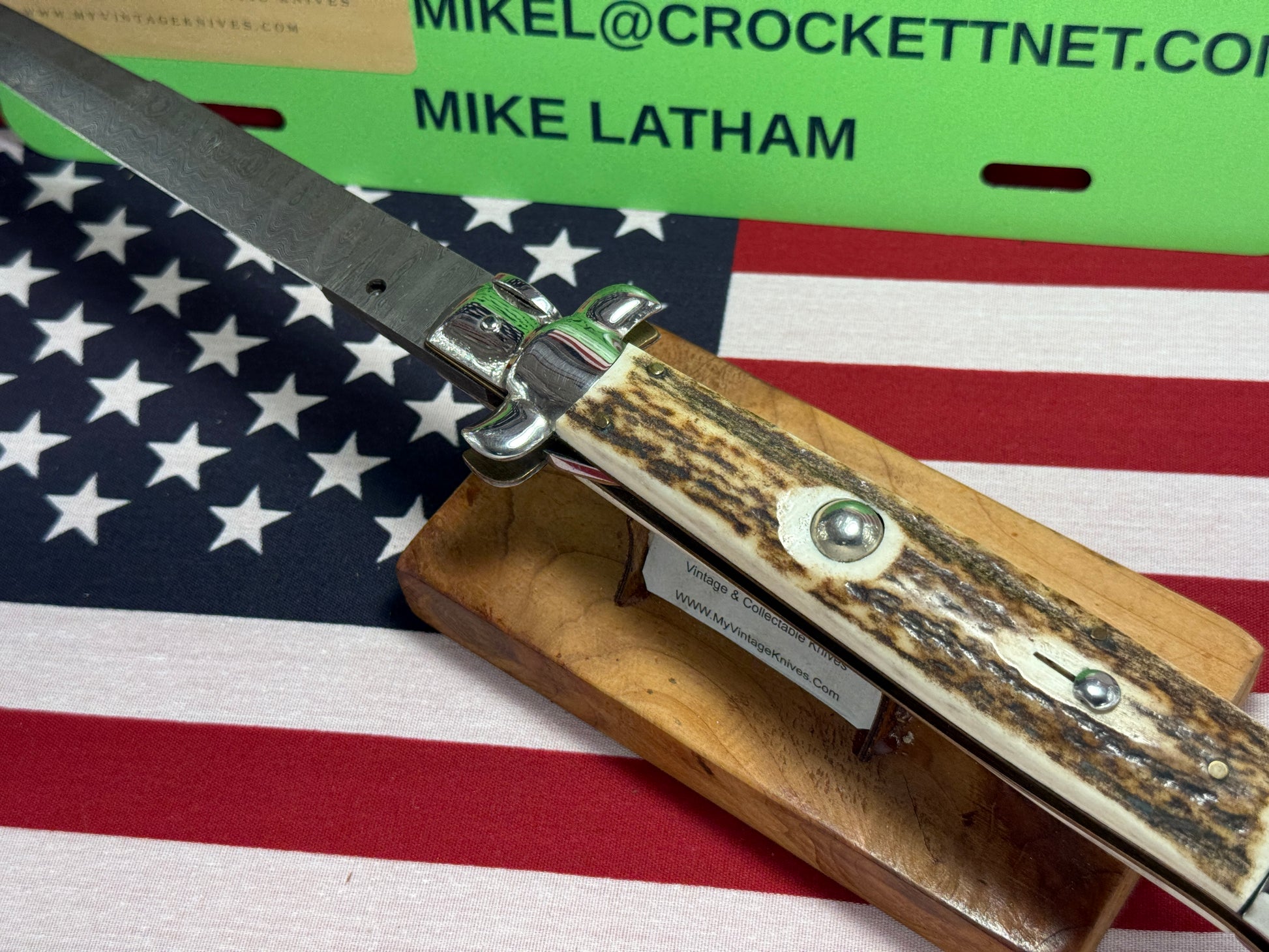 STERILE A.G.A. CAMPOLIN 2010 STILETTO SWIVEL BOLSTER DAMACUS STEEL 38 CM ITALIAN AUTOMATIC KNIFE STAG HANDLES