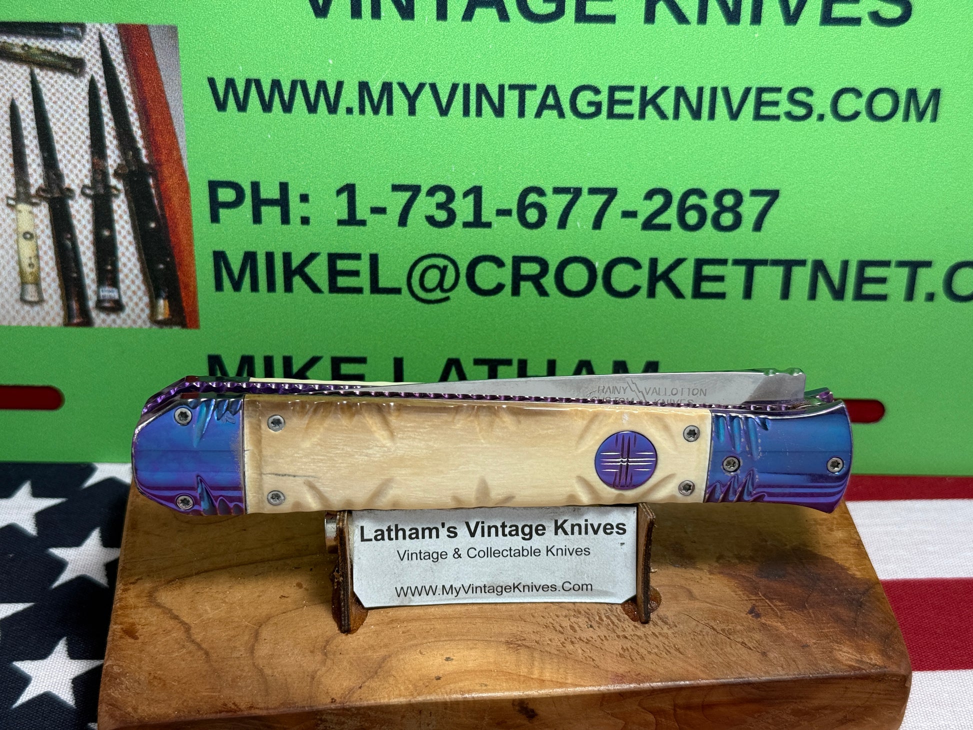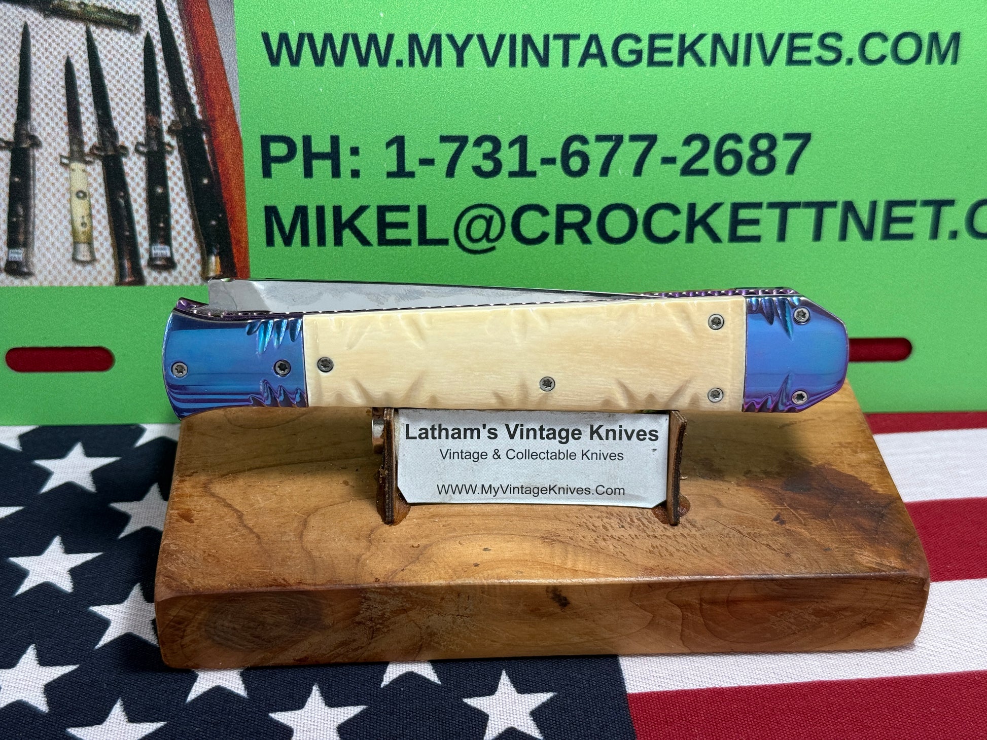 VALLOTTON, RAINY CUSTOM KNIVES 1998-2001 ERA ICE PICK COFFIN DAGGER CUSTOM AUTOMATIC KNIFE MAMMOTH IVORY HANDLES