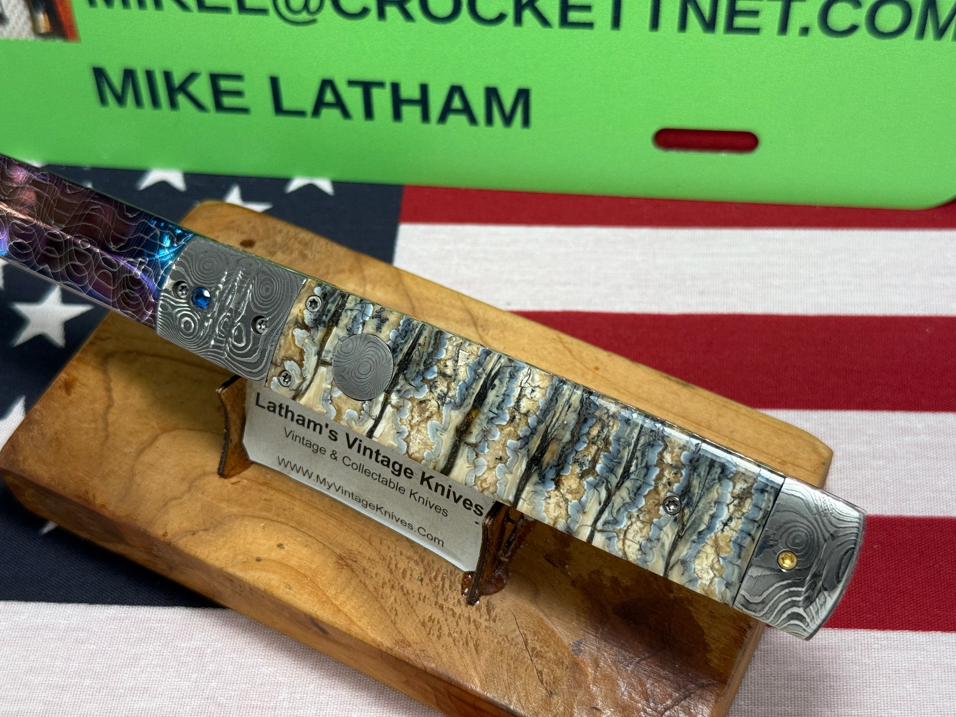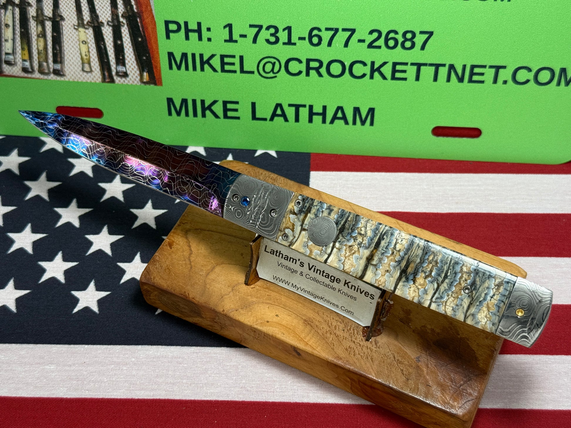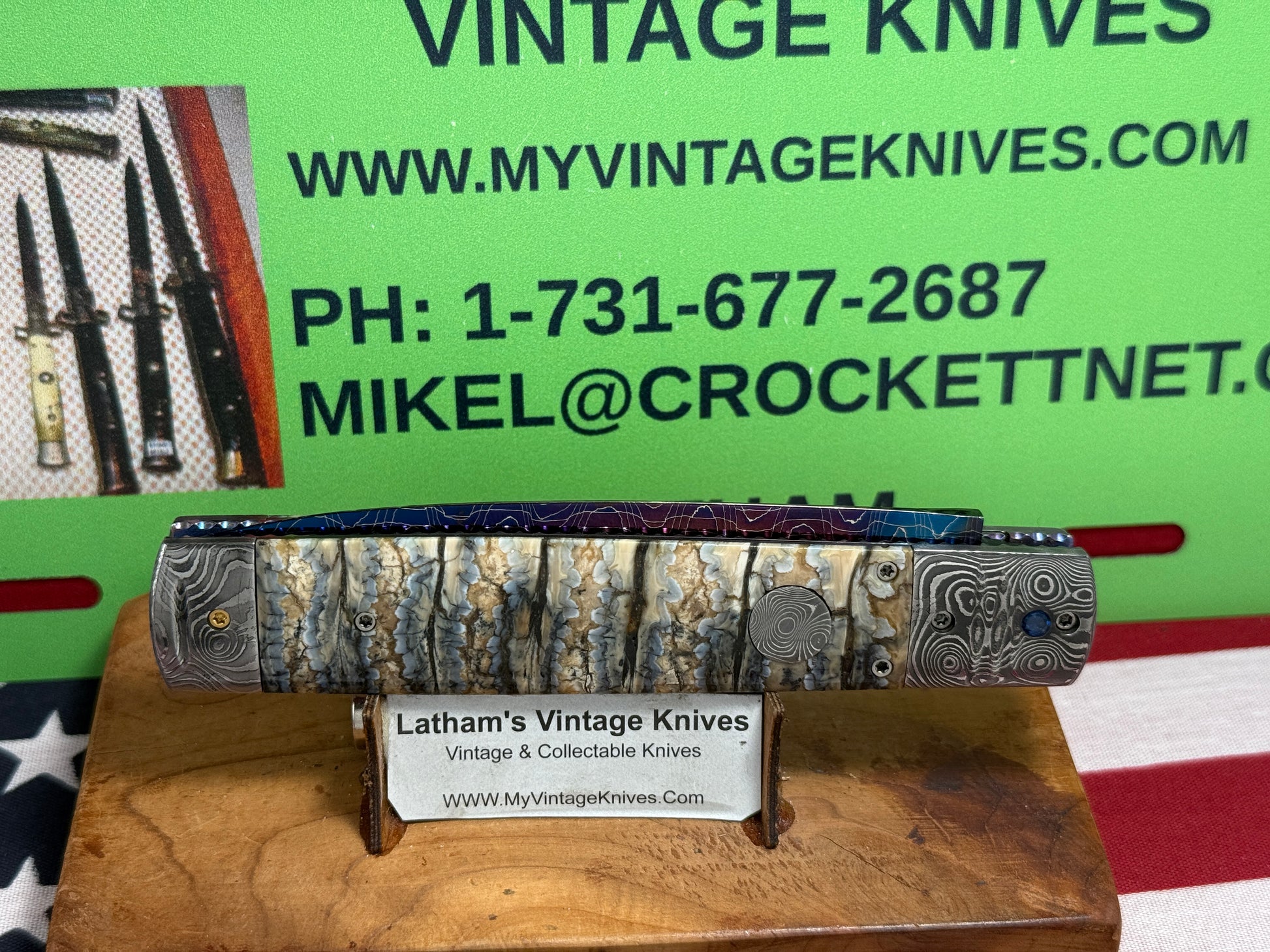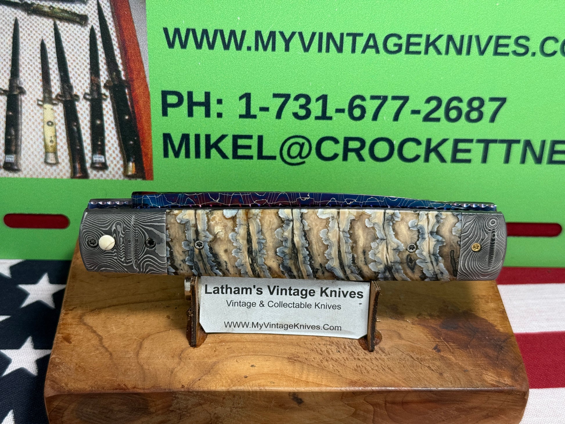 VALLOTTON, RAINY CUSTOM KNIVES 2005-2010 ERA D & D BLUE DAGGER BLADE JEWELS CUSTOM AUTOMATIC KNIFE MAMMOTH TOOTH HANDLES