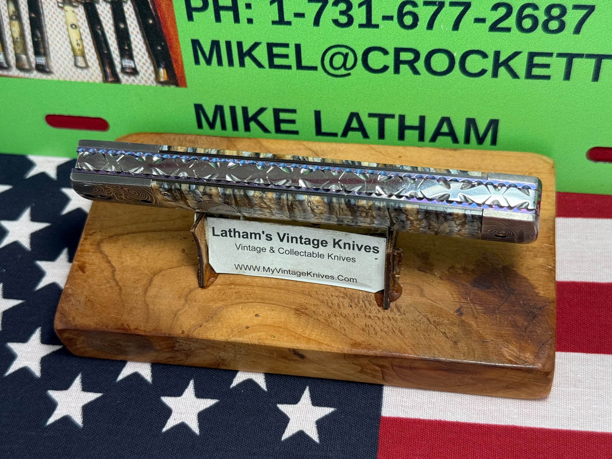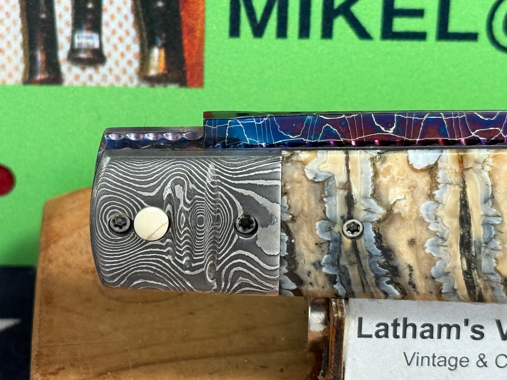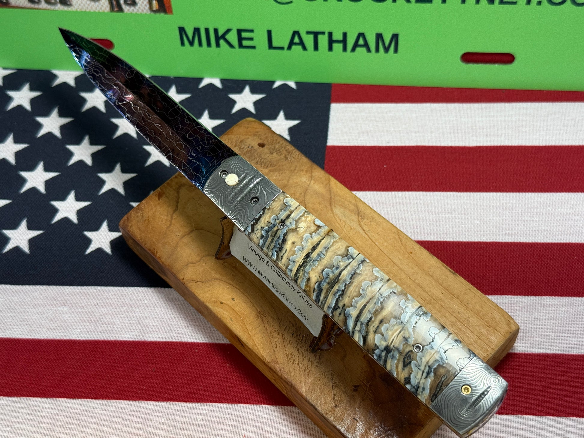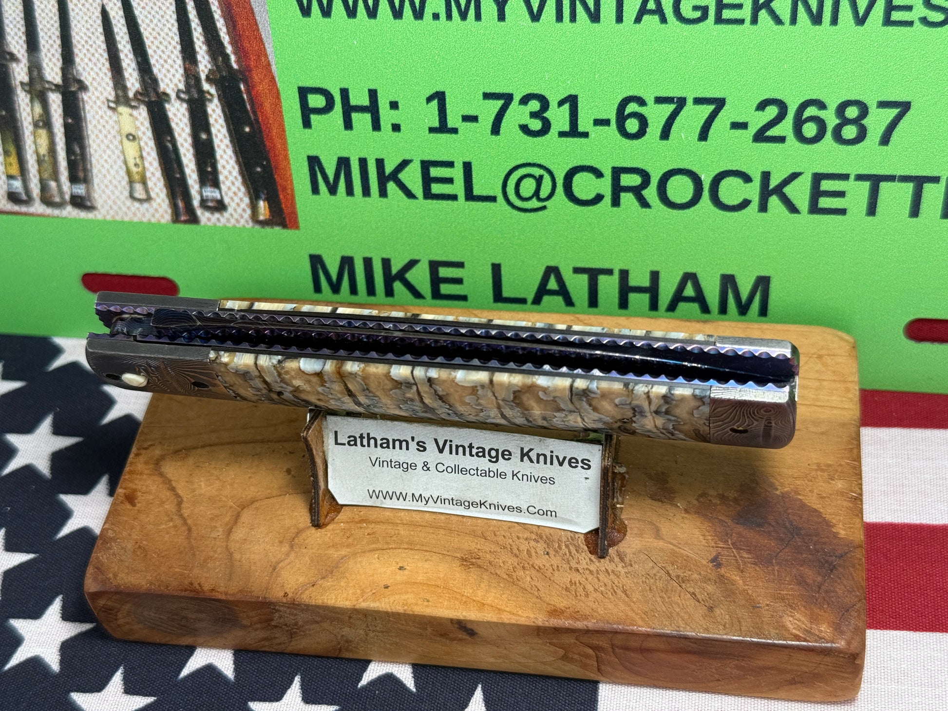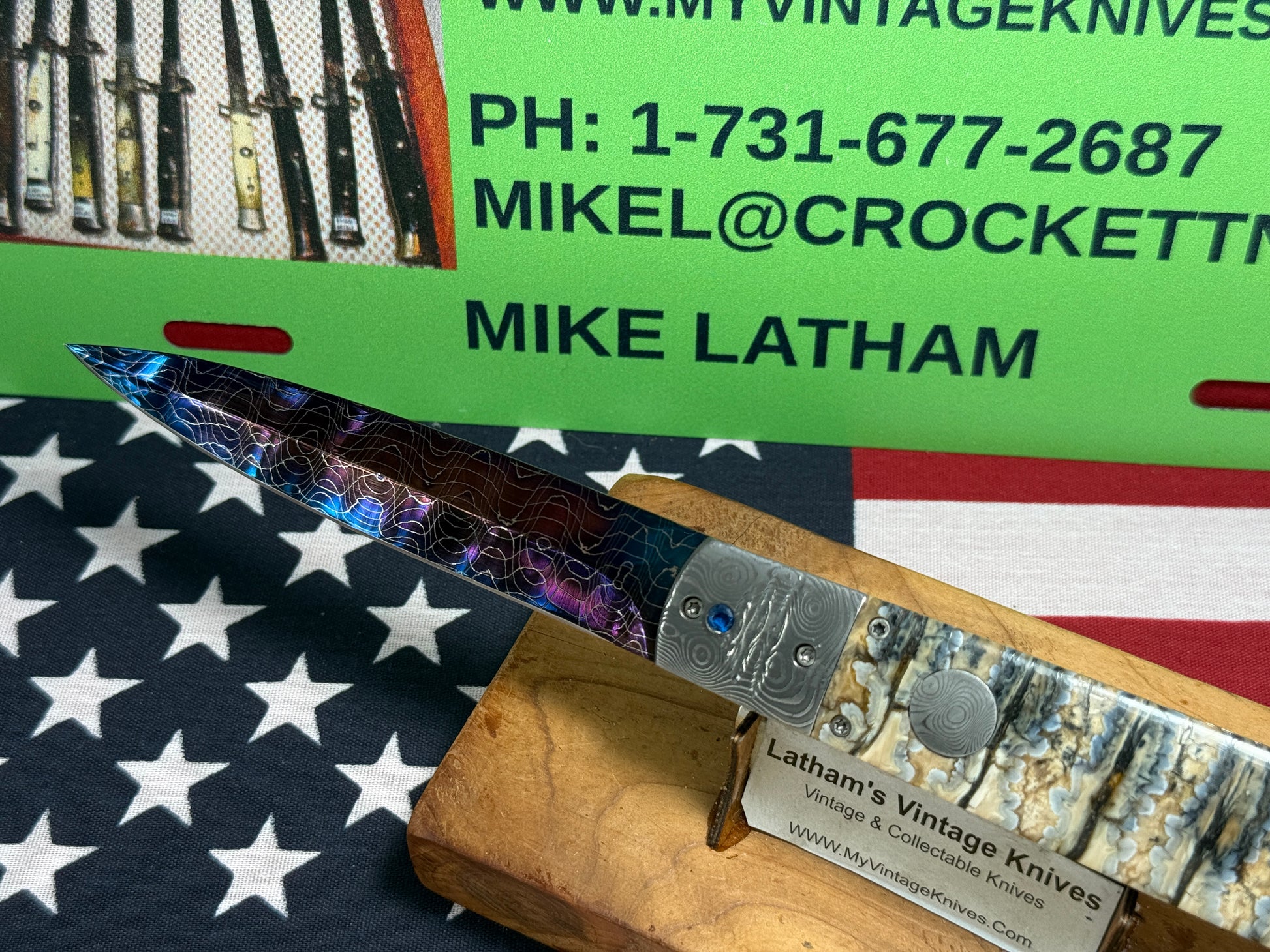 VALLOTTON, RAINY CUSTOM KNIVES 2005-2010 ERA D & D BLUE DAGGER BLADE JEWELS CUSTOM AUTOMATIC KNIFE MAMMOTH TOOTH HANDLES