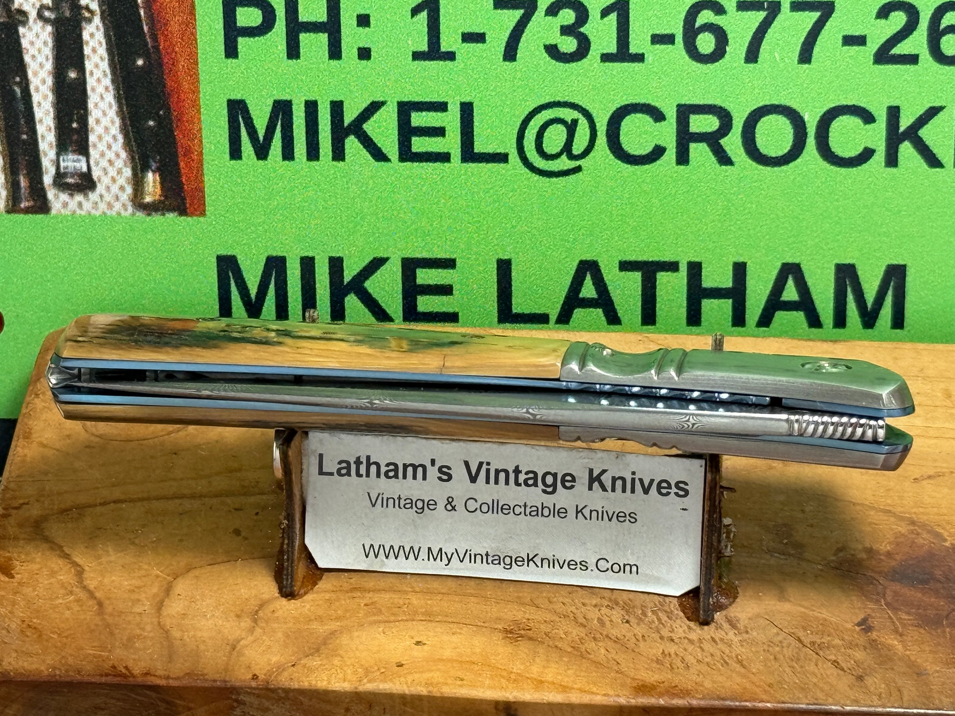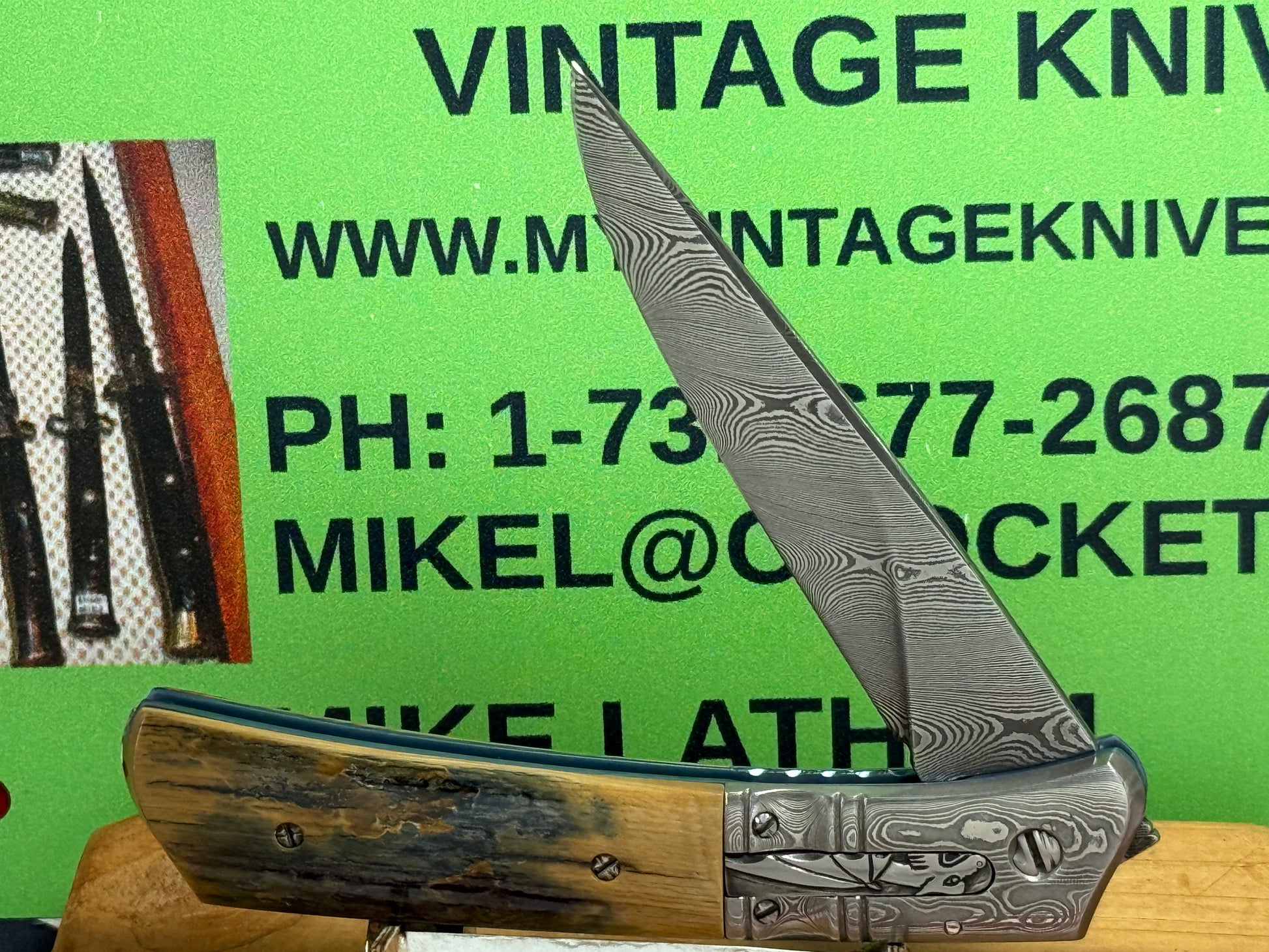 WILLIAMS, JASON CUSTOM KNIVES 2001-2003 ERA MEDIUM HUNTER DAMACUS STEEL CUSTOM AUTOMATIC KNIFE MAMMOTH IVORY BARK SCALES